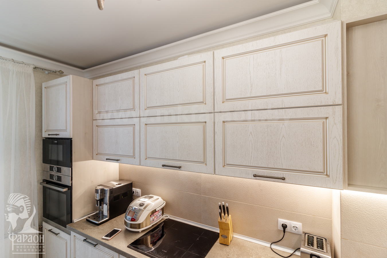 Комбинированные фасады из МДФ. Ширина кухни 260 см.