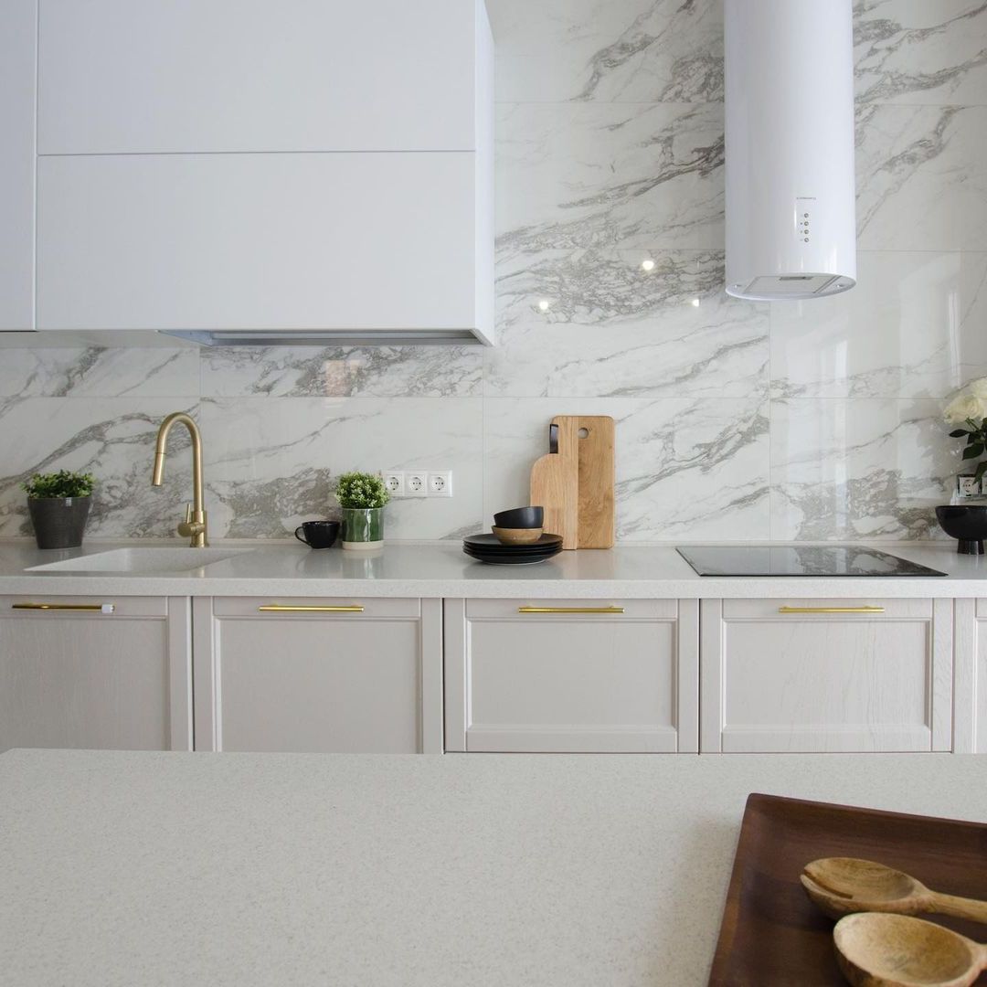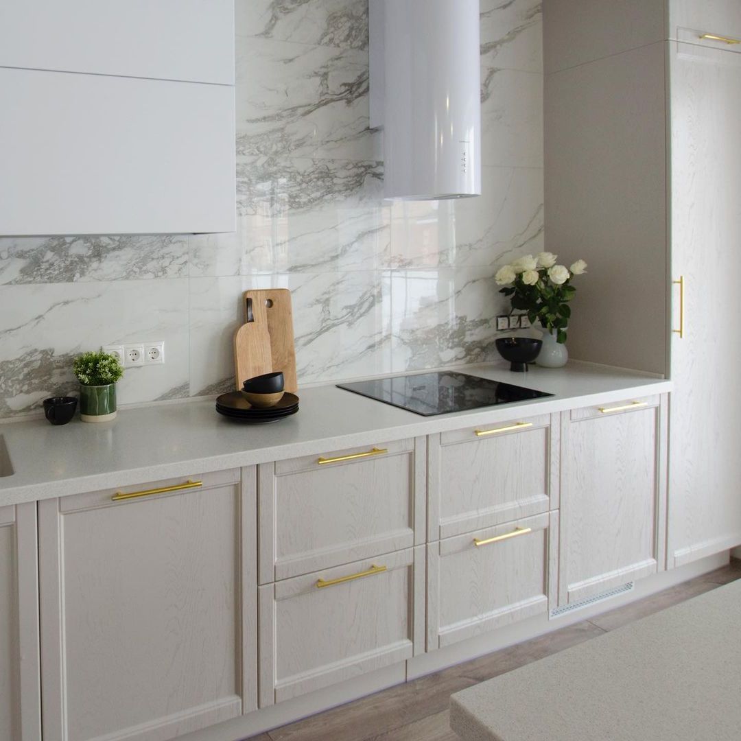Современная линейная кухня. Разные цветовые решения фасадов и столешницы.