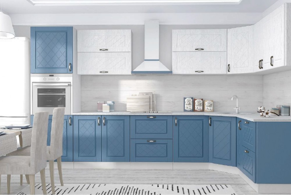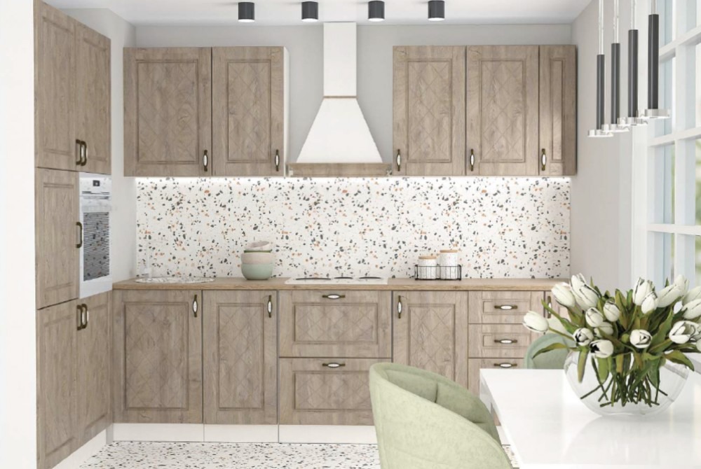 Ромбовидные фасады кухни привлекают внимание и придают кухне уникальный вид. Кухня оснащена удобными модулями, которые помогут вам организовать пространство и улучшить функциональность вашей кухни.