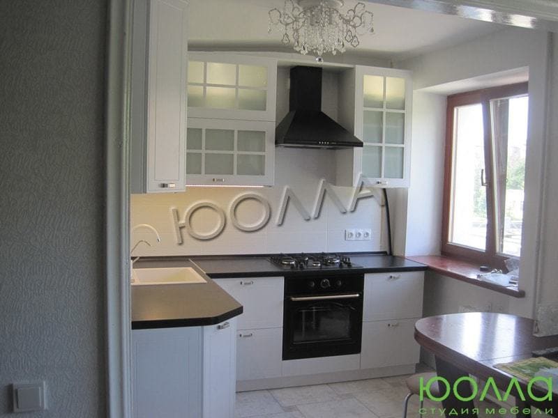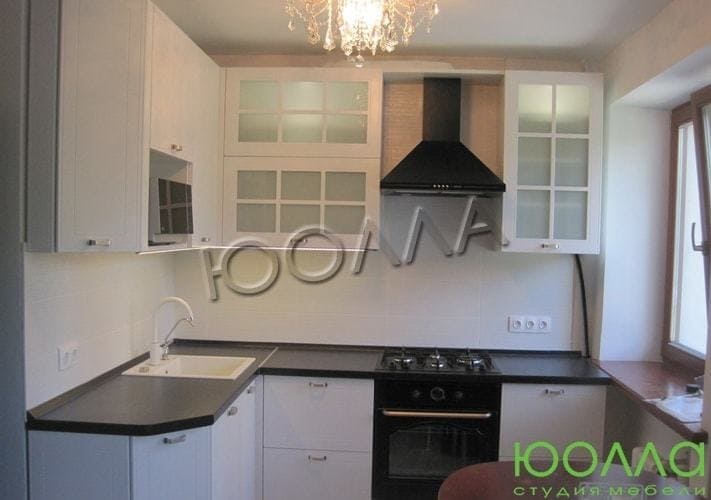 Белая угловая кухня с контрастной черной столешницей. Лицевая часть верхнего фасада с аккуратными витринами из полупрозрачного лакомата. Торцевой угол скошен и укомплектован диагональными дверцами.