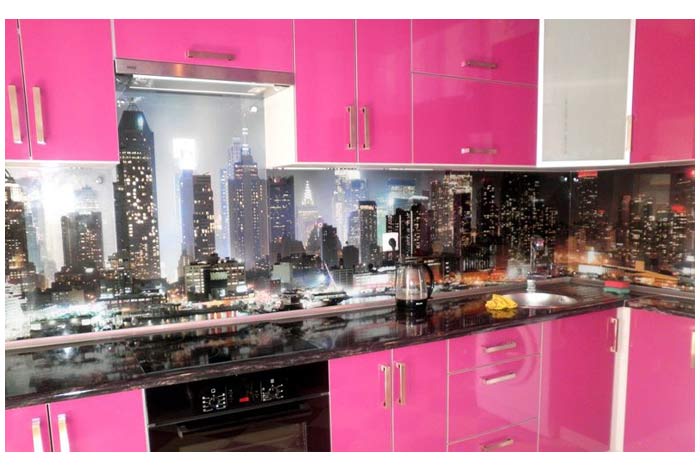 Угловая кухня привлекает внимание своим ярким дизайном. Фасады выполнены в розовом цвете, гармонично сочетающемся с черным цветом столешницы. На стеклянные скинали нанесена декоративная фотопечать с изображением ночного города. Гарнитур выглядит необычайно стильно и современно.
