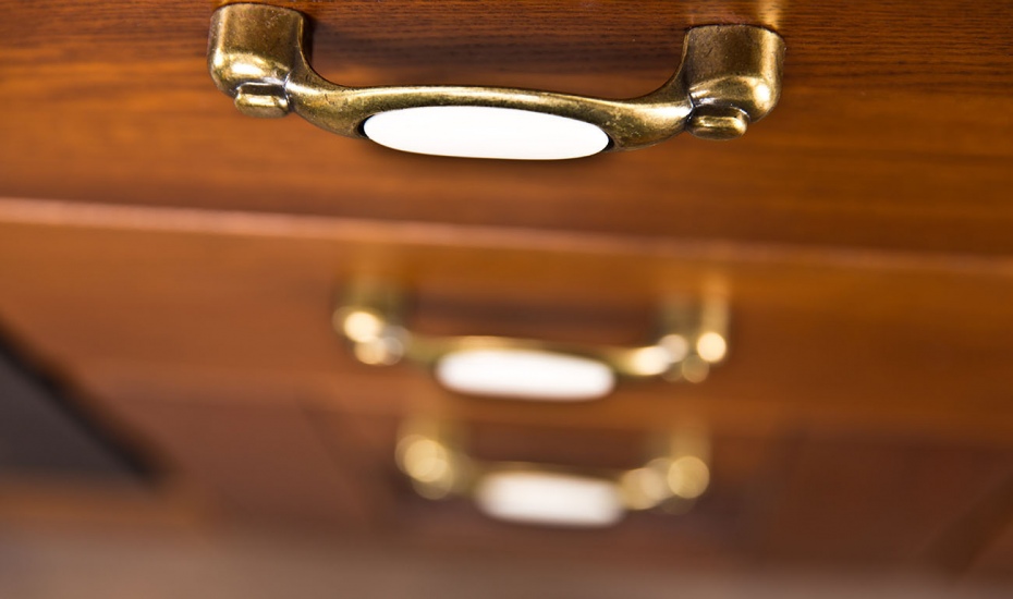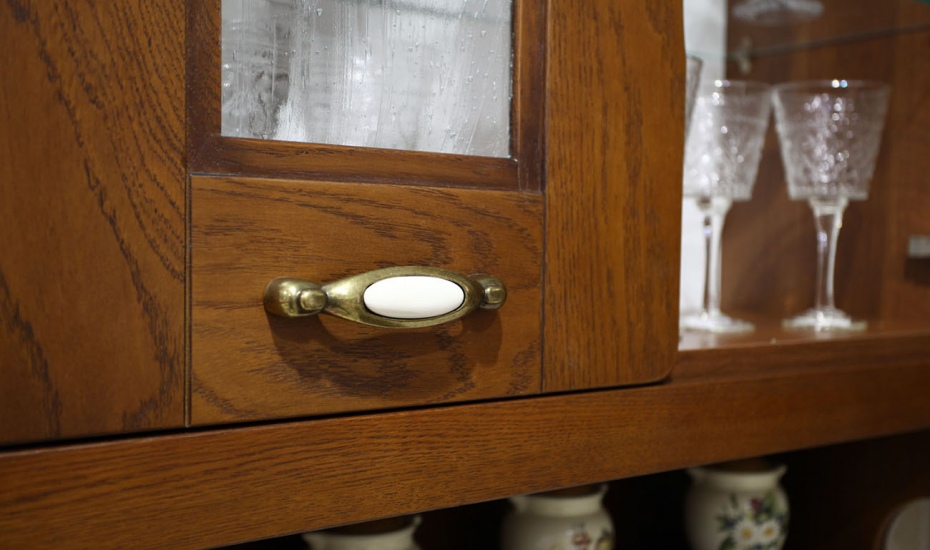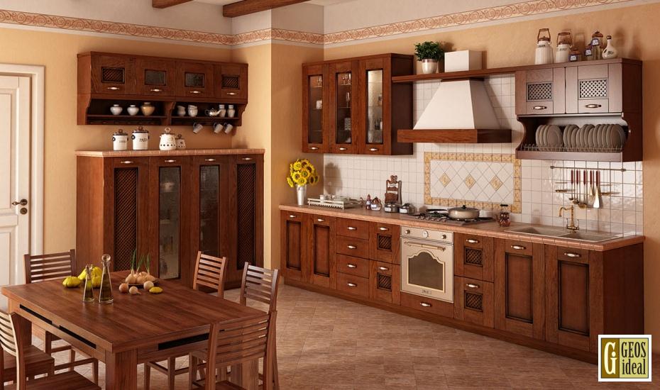 Створки оснащены изящными бронзовыми ручками, которые подчеркивают присутствующий в модели эффект «под старину». В комплекте имеется несколько открытых полочек и массивный резной короб для вытяжки. Шкафчик для хранения посуды не предусматривает наличие створки.