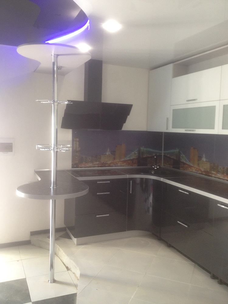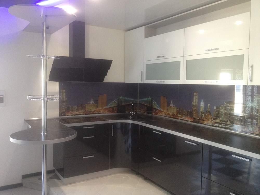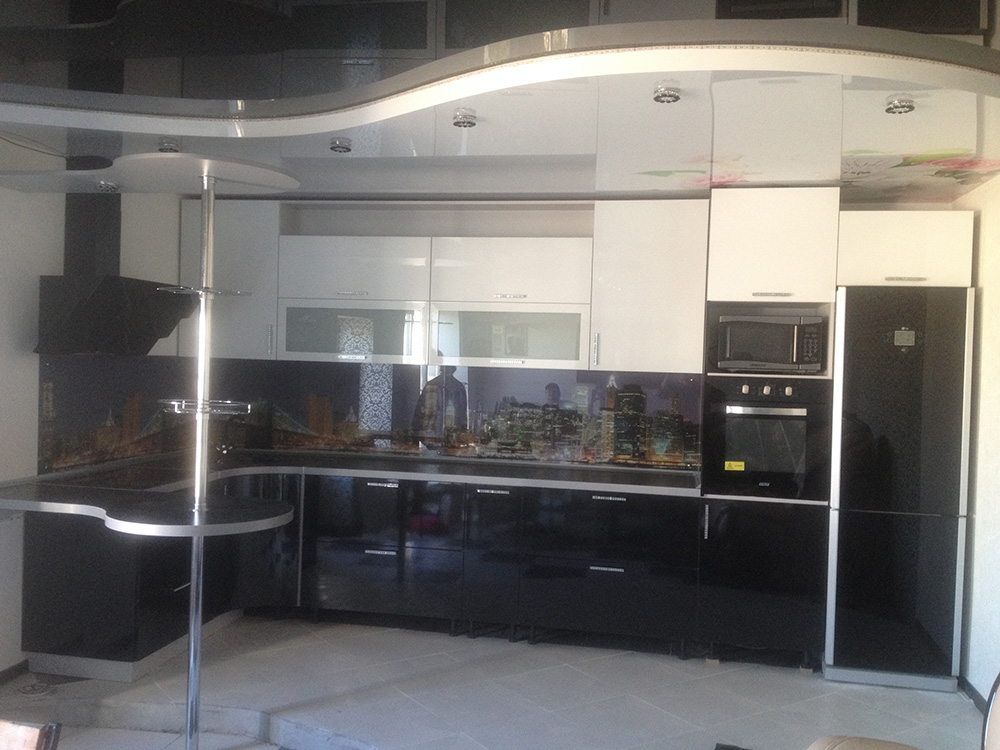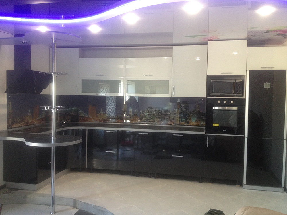 Черно-белая глянцевая кухня с барной стойкой и скинали