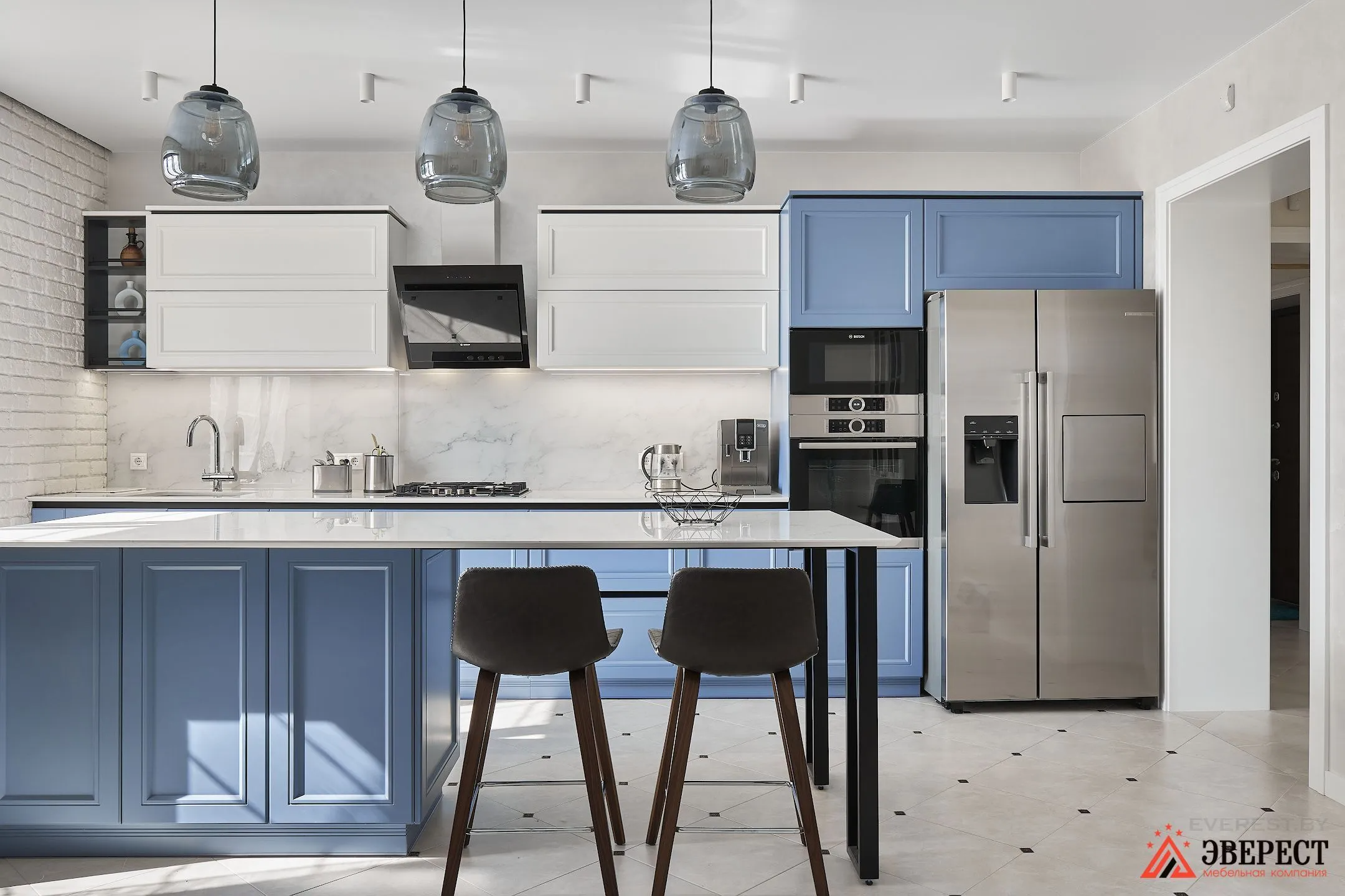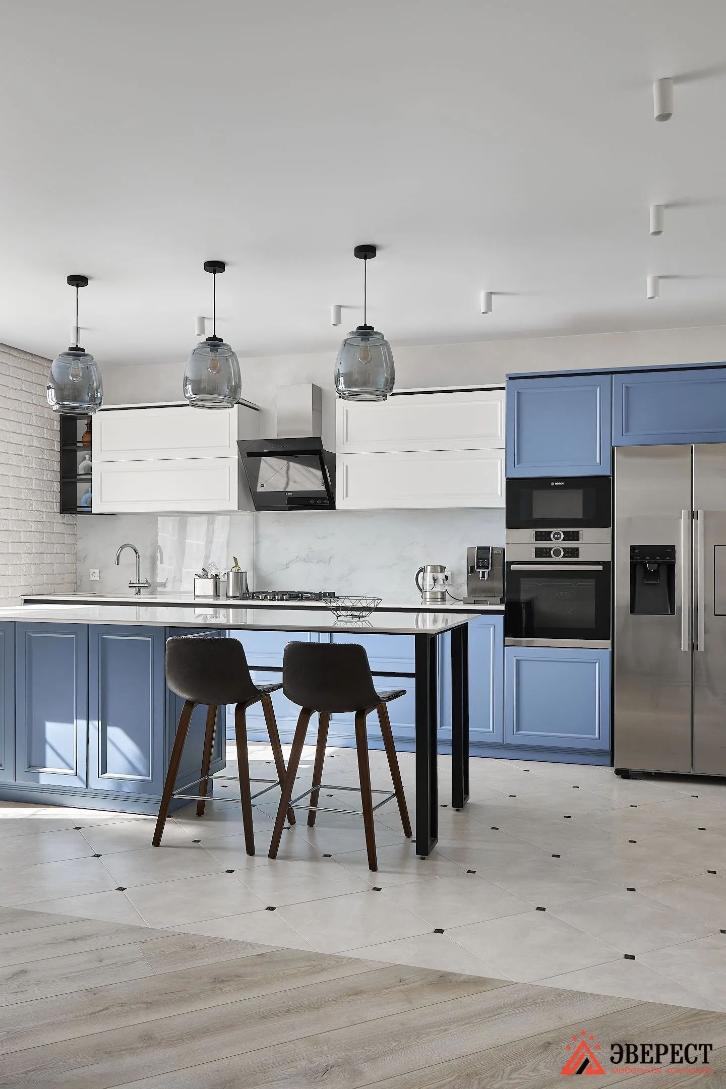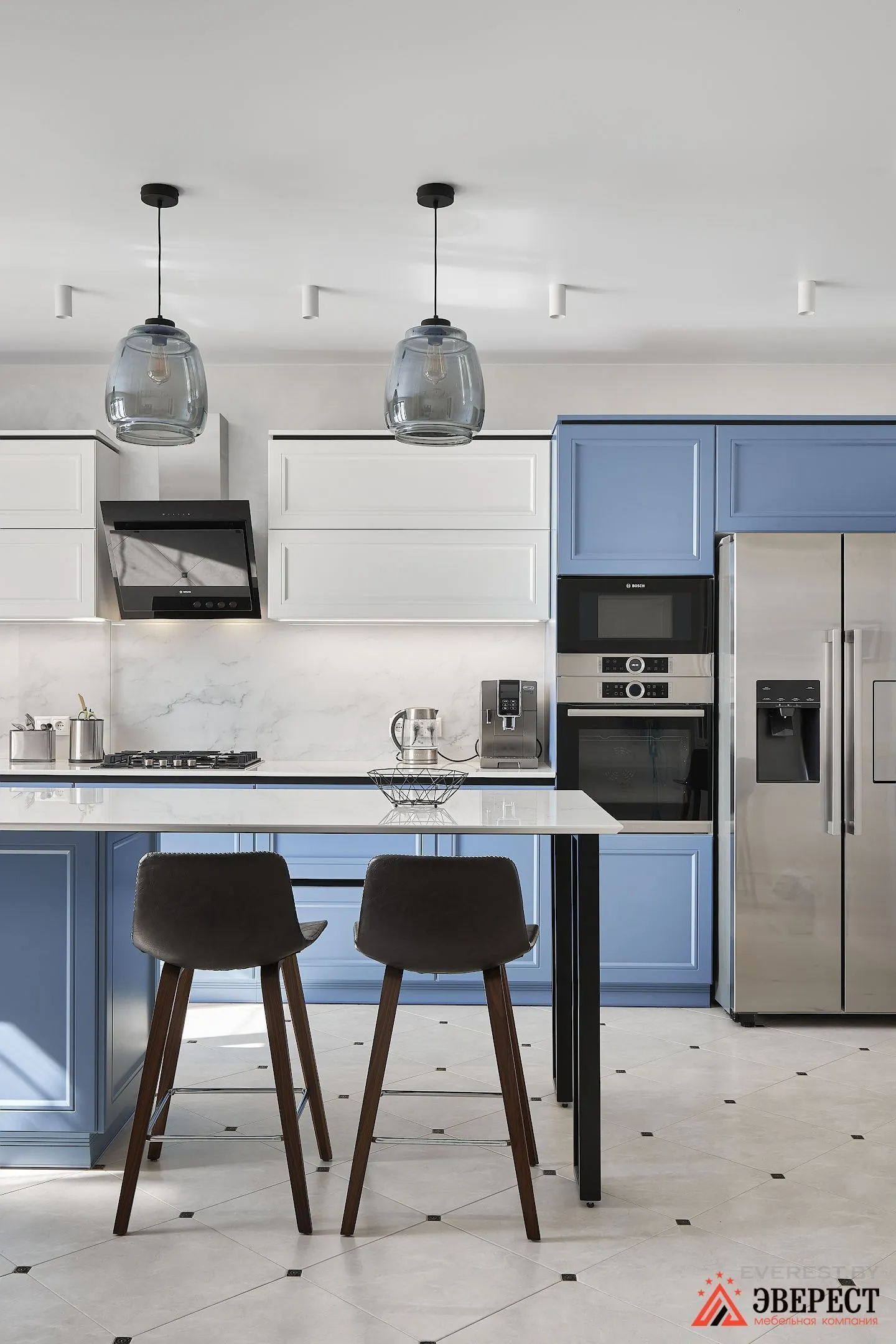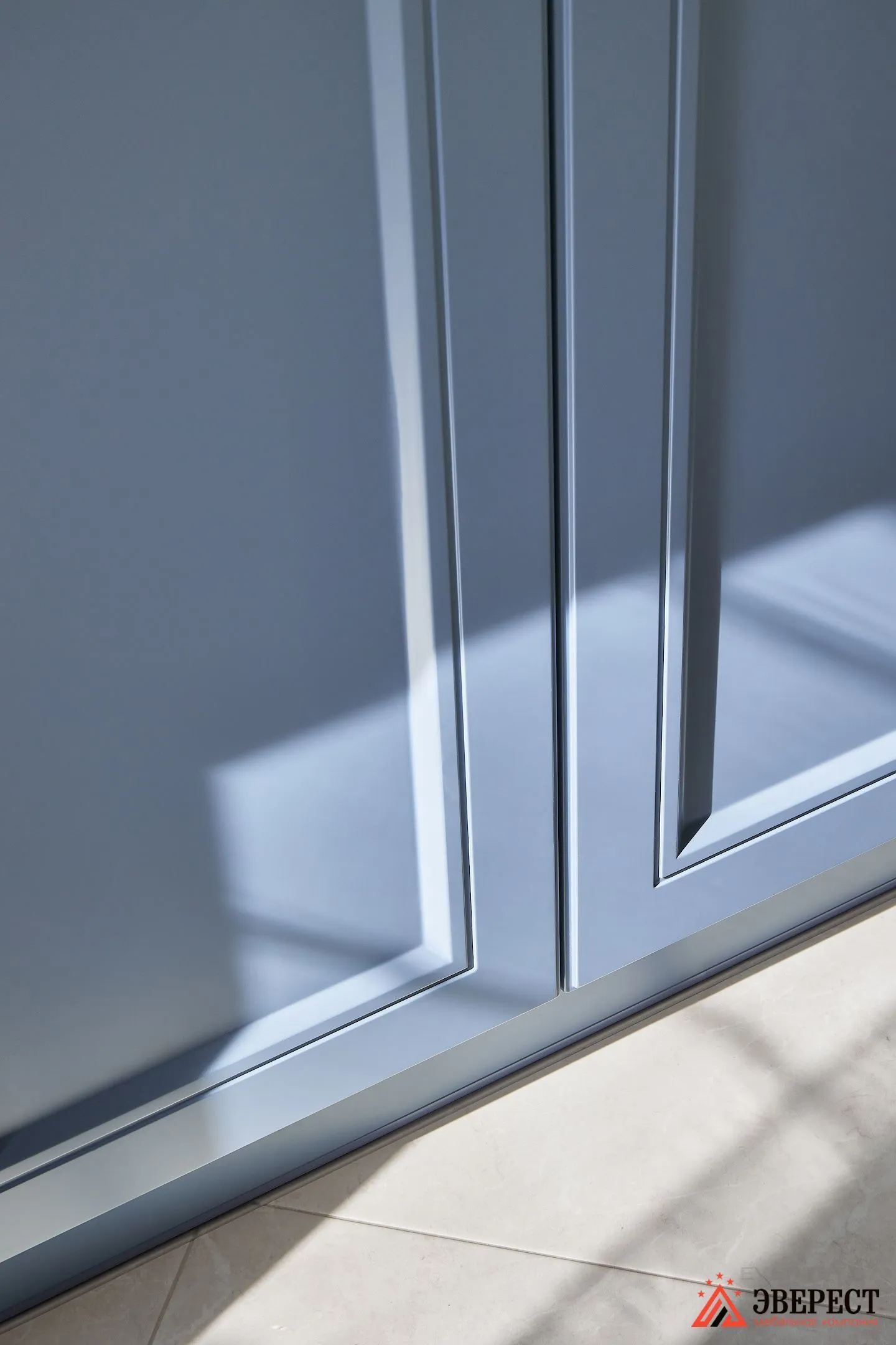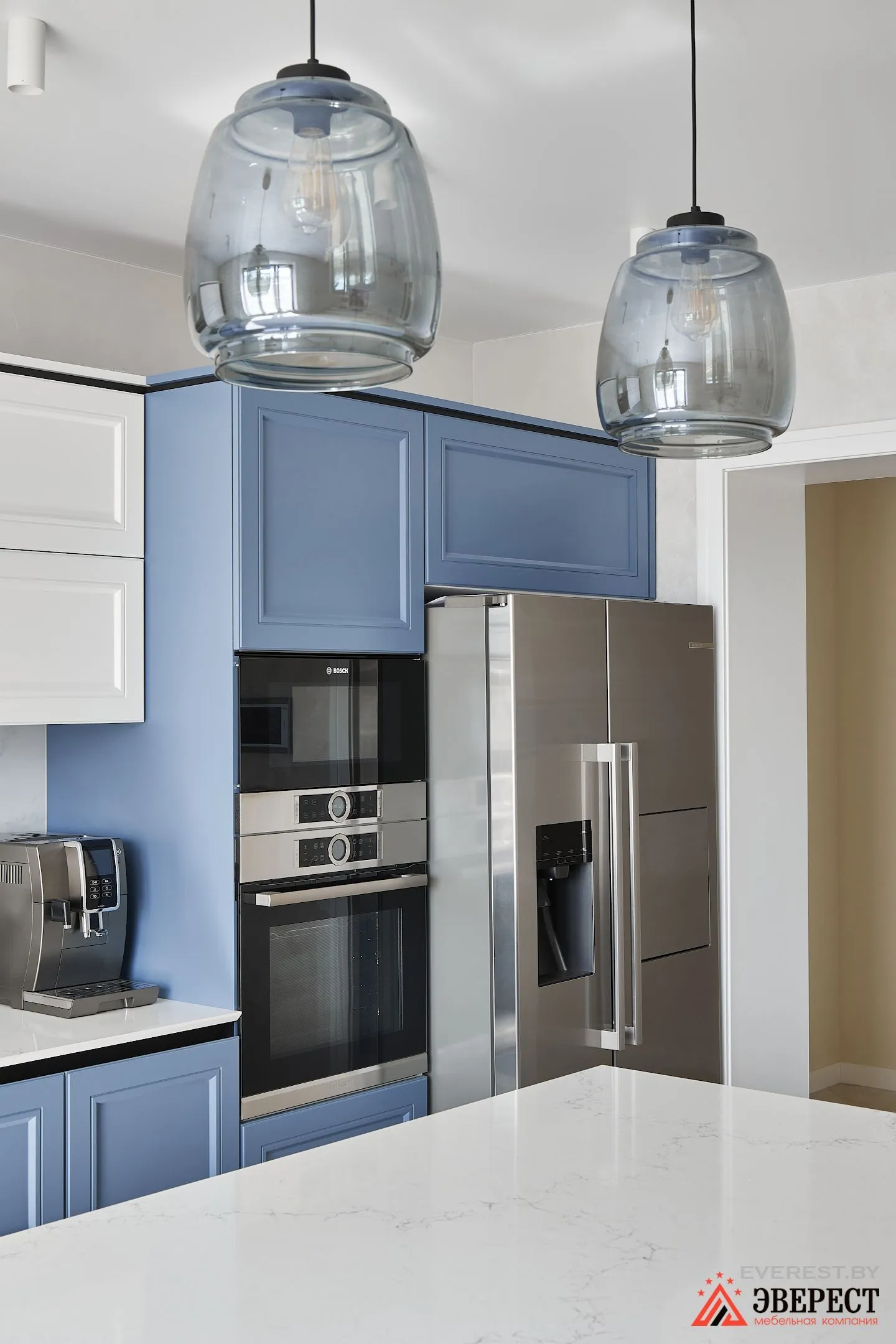 ▪️ Фрезерованные фасады выполнены из крашенного матового МДФ. Необычное сочетание цветов очень освежает помещение. Помещение выглядит еще более просторным и наполненным светом.