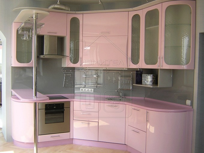 Кухня с барной стойкой в розовом цвете