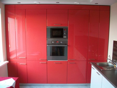 Основной элемент этого гарнитура - это внушительная по размерам группа шкафов красного цвета. Здесь найдется место как для бытовой техники различного размера и назначения, так и для прочей кухонной утвари и съестных припасов. Рабочая же зона выполнена из сочетания материалов серого (столешница) и белого (фасады) оттенков.