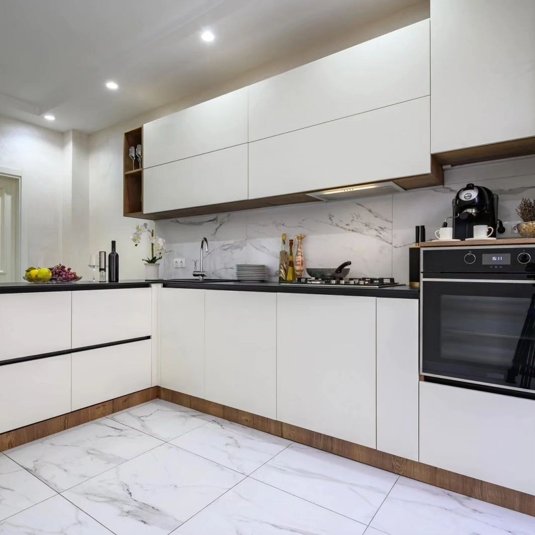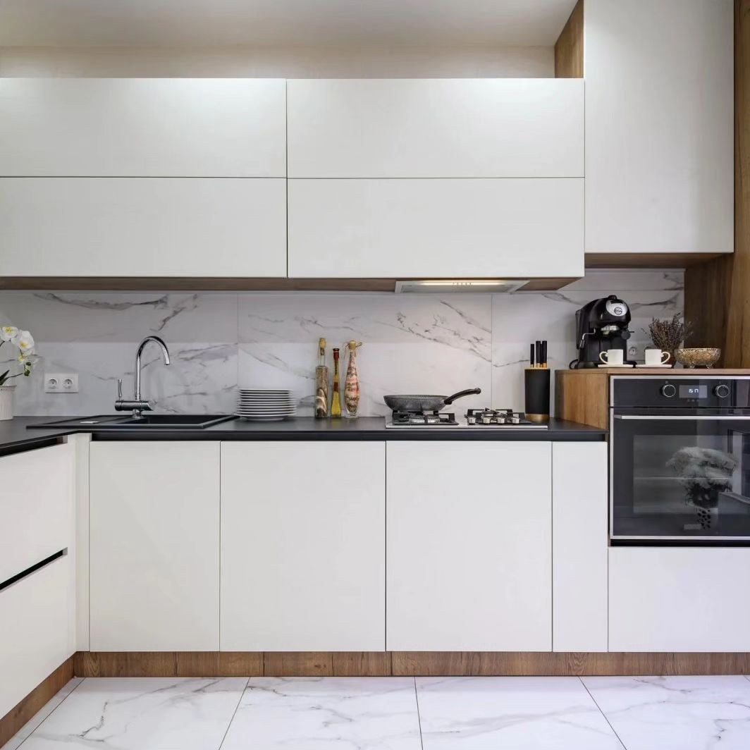 Фасады белого цвета без ручек, пенал для встраиваемой техники.
