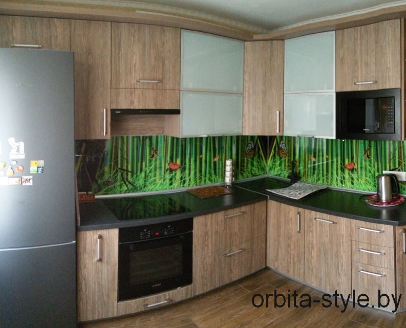 Кухня углового типа с матовыми фасадами, часть верхних модулей оснащена непрозрачным белым остеклением. Вся фурнитура выполнена из хрома, рейлингового типа. Фасады имитируют яркий рисунок древесного волокна, вытяжка скрыта в специальной нише. Модель кухни дополнена сочной по цвету скиналью растительной тематики.