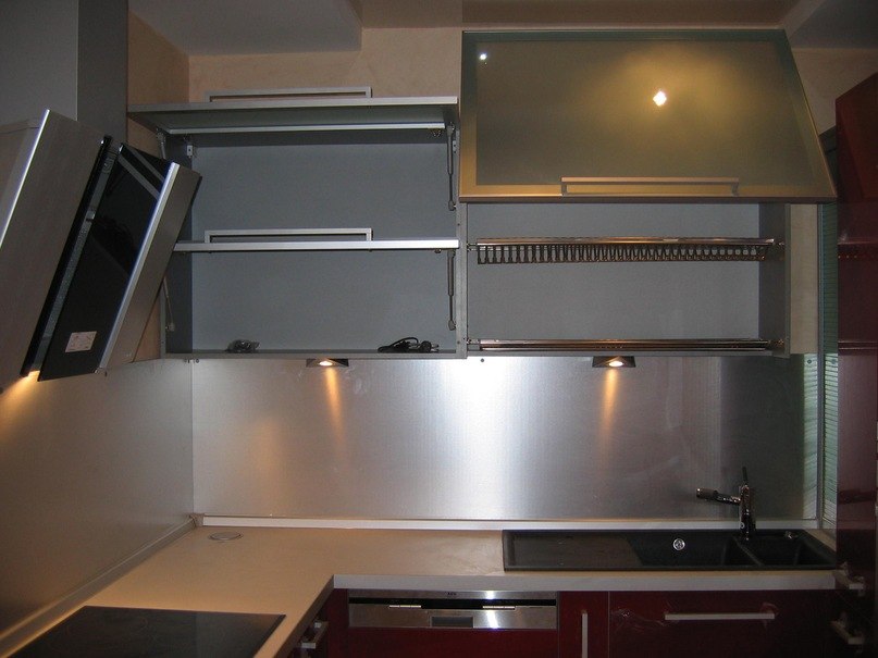 Угловая кухня с застекленными фасадами в алюминиевом профиле.