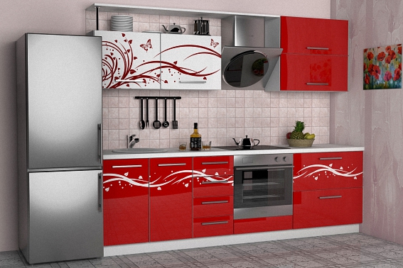 Линейный гарнитур привлекает своим ярким и нестандартным дизайном. Он изготовлен из термостойких и экологически чистых материалов. Черные фасады декорированы огненной фотопечатью. Вся мебель украшена удлиненной хромированной фурнитурой.