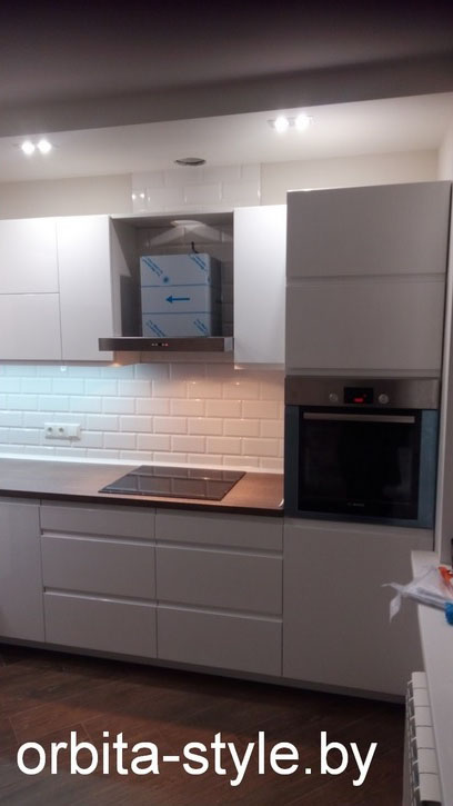 Современная кухня из МДФ. Удлиненные верхние шкафы.