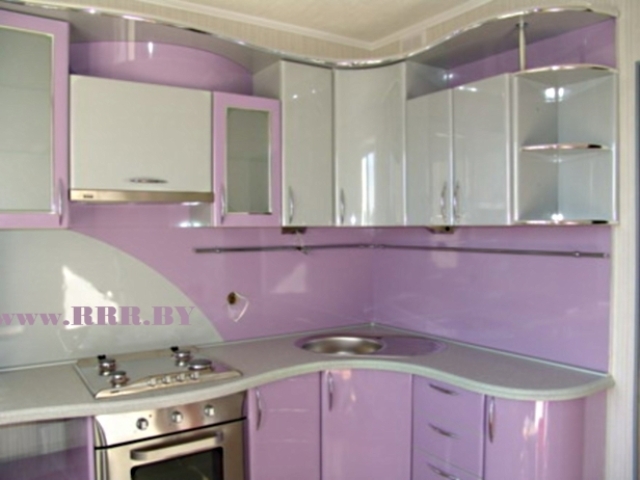 Кухонный гарнитур выполнен в современном стиле. Он выделяется своим простым, но в тоже время необычным дизайном. Изогнутая столешница создает легкий эффект волны. Фасады и скинали выполнены в розовом глянцевом оформлении.