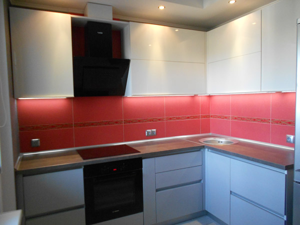 Кухня имеет угловую конструкцию, характеризуется комбинированным фасадом: нижние фасады изготовлены из ЛДСП, верхние – из пластика. Белый цвет оформления визуально расширит помещение, сделает его светлее.