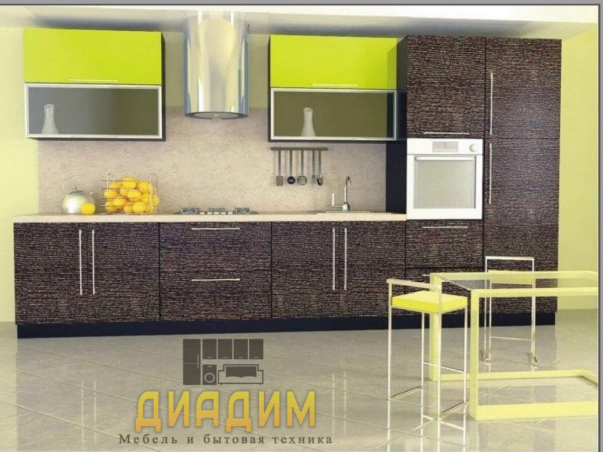 Фасадам характерен коричневый цвет. Салатовые навесные шкафы застеклены лакоматом. Фурнитура металлического окраса длинная. Форма конструкции – прямая. Модель смотрится современно. Ее необычные вкрапления на коричневой поверхности будут выделяться среди интерьера помещения.