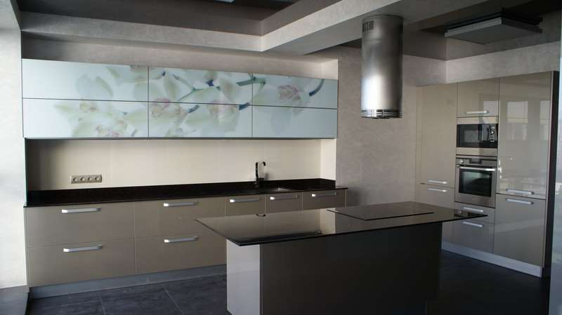 Оригинальный кухонный гарнитур имеет яркие фасады с нанесенной фотопечатью. Дополнительным элементов композиции выступает островная часть, выполняющая роль обеденного стола. Минималистичный дизайн кухни позволяет ей легко сочетаться с различными вариантами отделки. Высокое качество материалов и удобная фурнитура обеспечивают продолжительный срок службы.