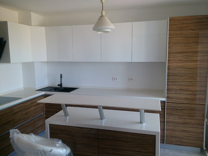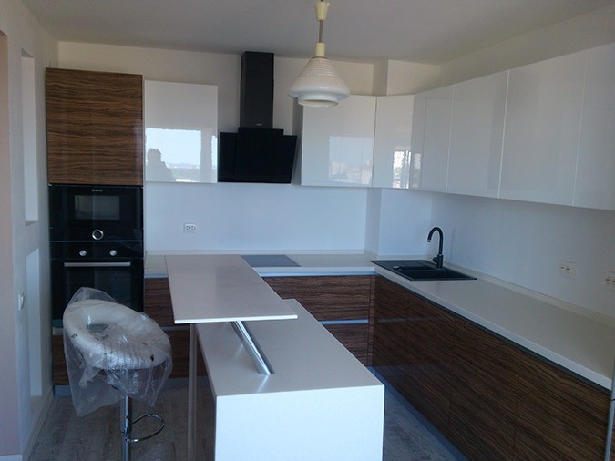 Кухня с островом с пластиковыми глянцевыми фасадами