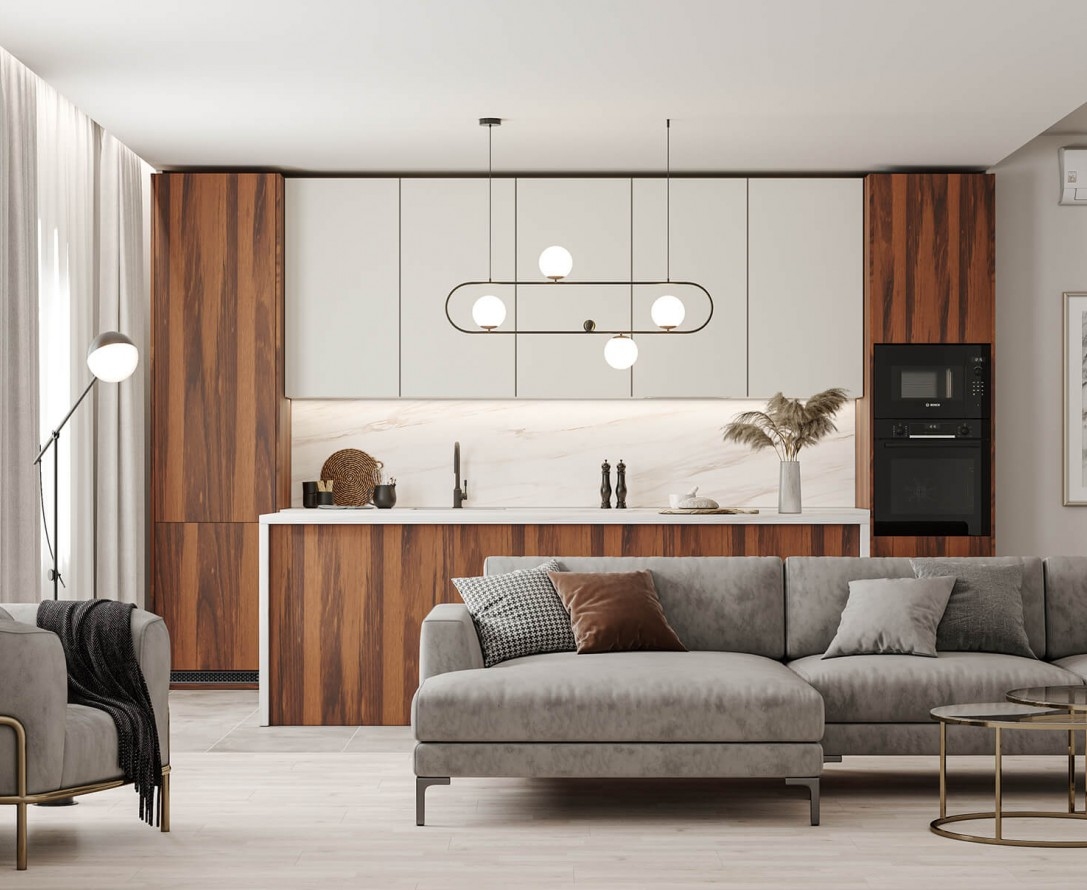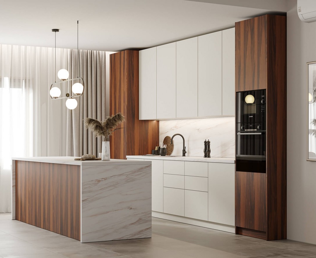 код 146231Минималистичная кухня от фабрики ЗОВ с комбинированными фасадами из шпона и пластика.