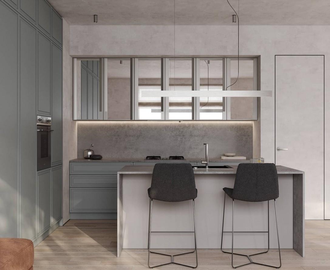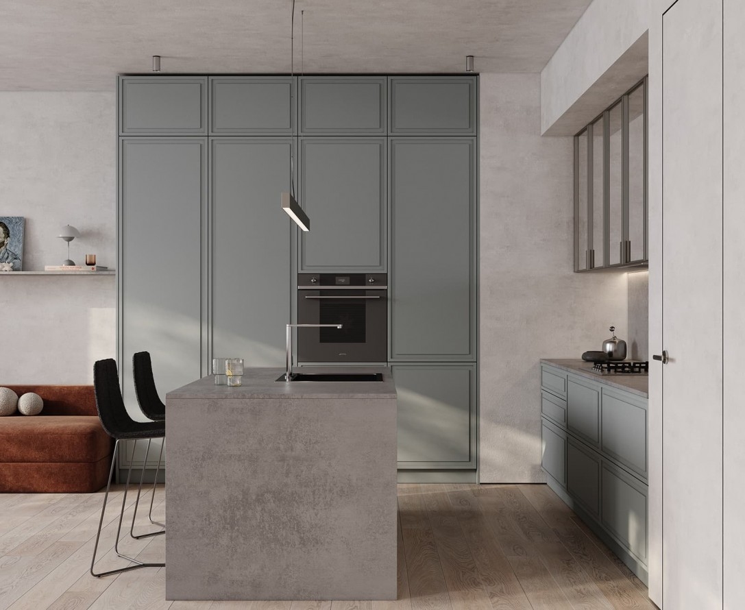 Утонченная и функциональная кухня в матовых серых оттенках. Фасады из крашенного МДФ.