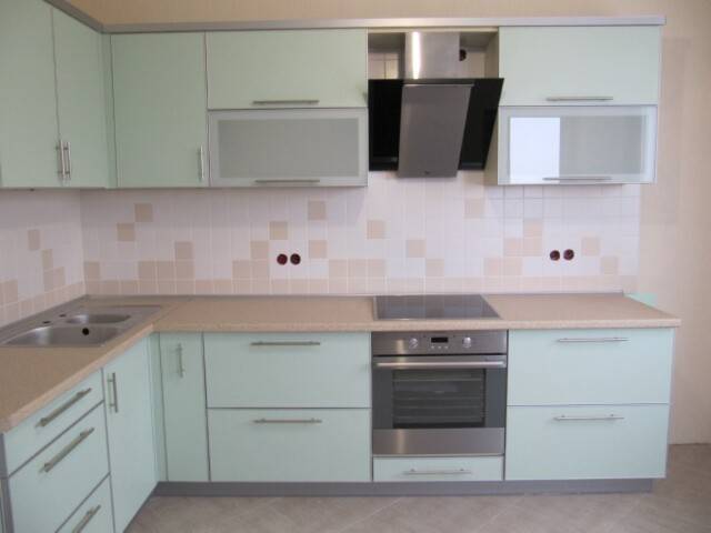 Приятный оттенок фасадов является ненавязчивым украшением этой модели. Столешница выполнена из постформинга нежно-бежевого цвета, который идеально подходит к гарнитуру. Кухня подойдет для большого помещения с выступающими углами.