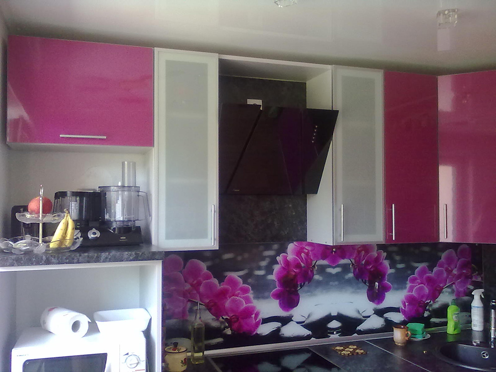 Фасады с фрезеровкой, витражная вставка. Ширина кухни 210 см.