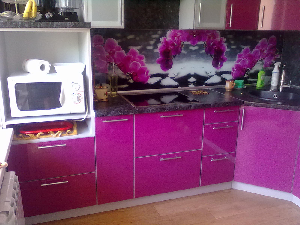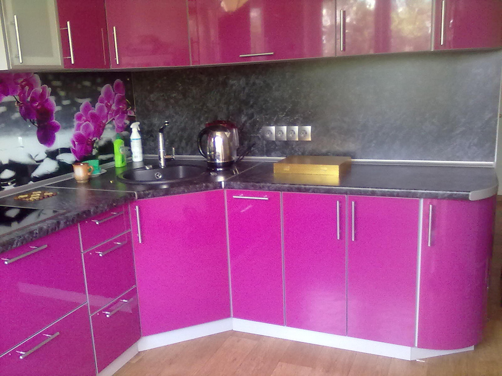 Кухня с пеналом угловая с розовым фасадом