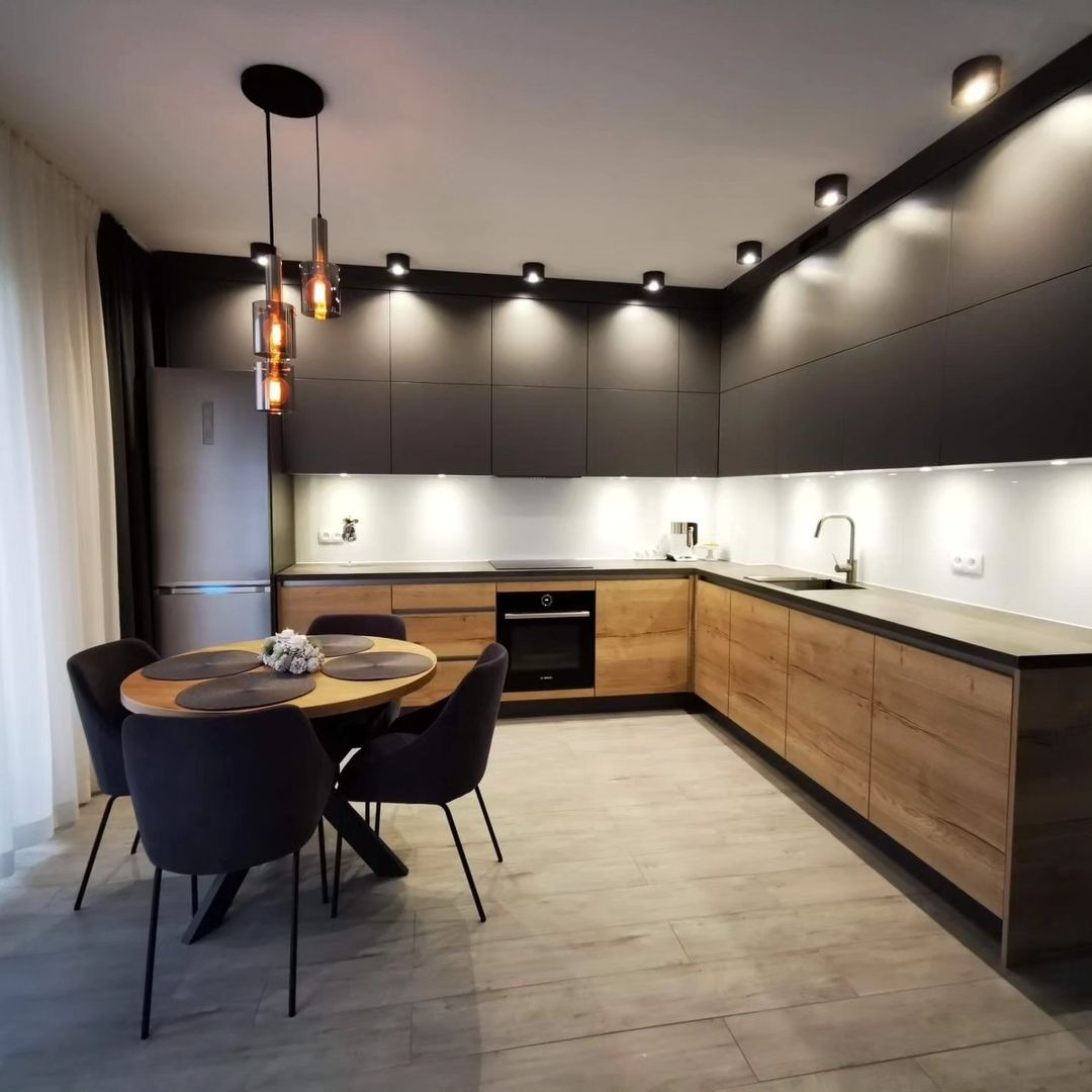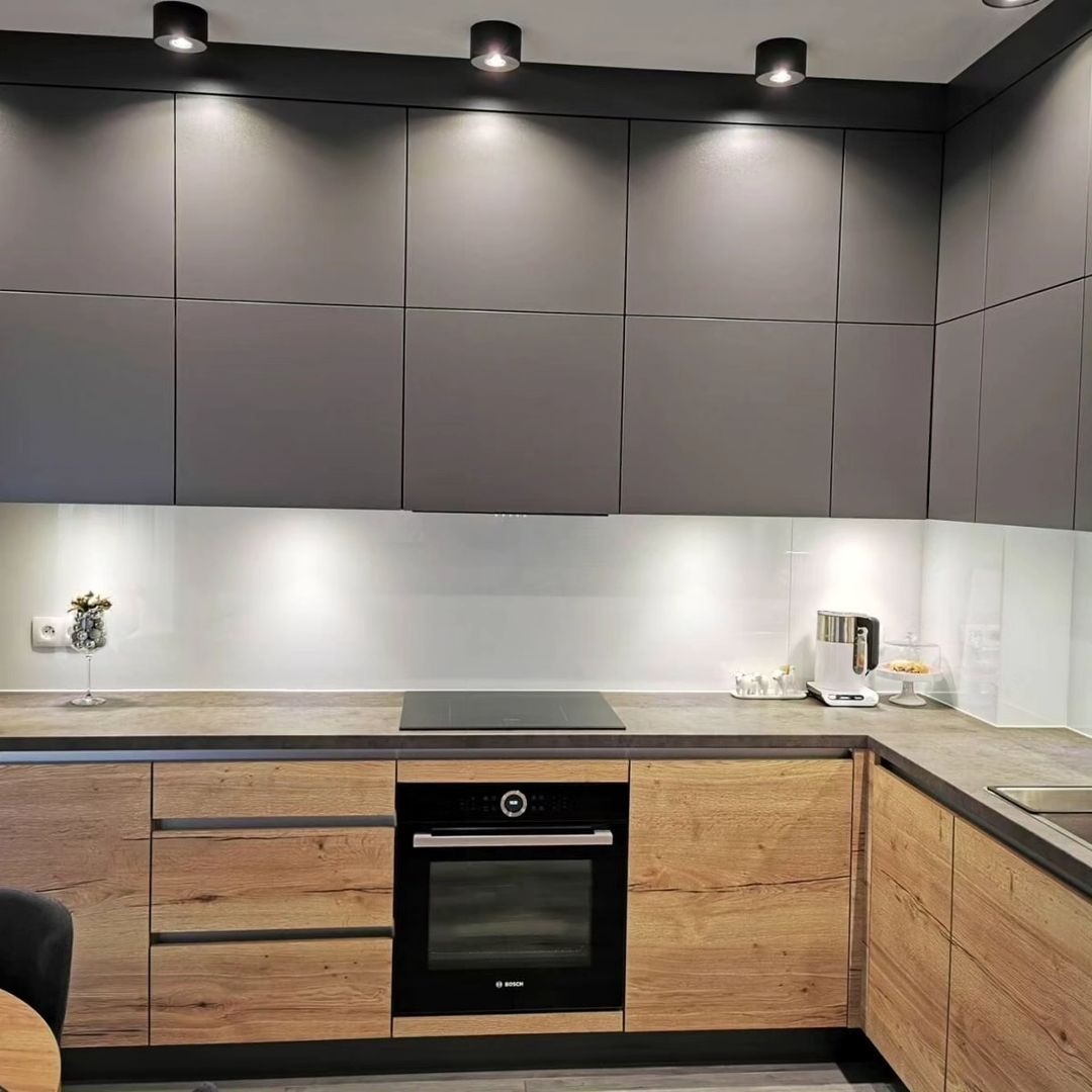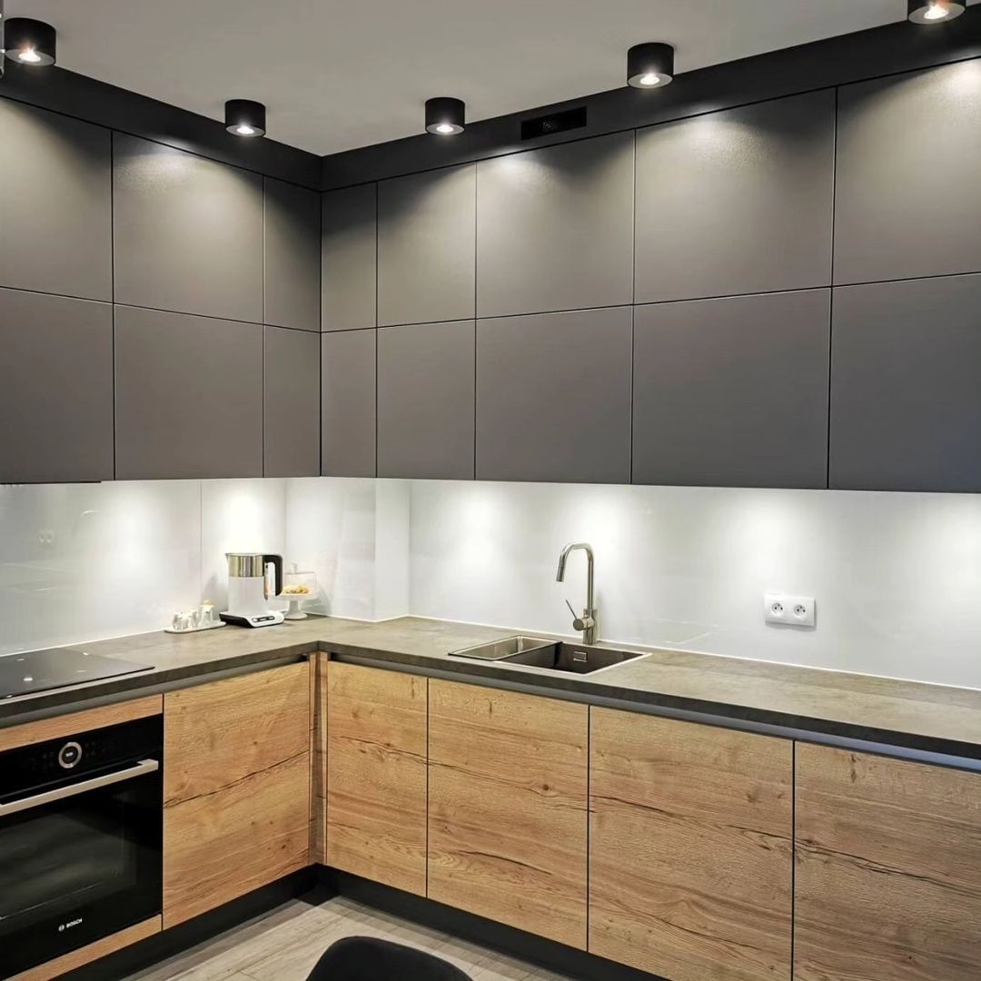 Современные кухни из МДФ и ЛДСП, пластика, металла, закаленного стекла.