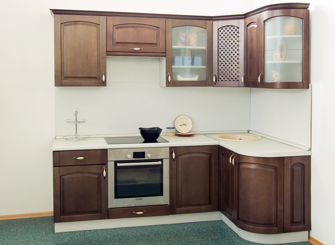 Небольшая угловая кухня с радиусным торцом и остеклением в легкой пескоструйной обработке. Фасады из массива в классической обработке с филенками цвета темного ореха. Диагональный угол верха с решетчатой дверцей. Округлые ручки-скобы под бронзу с декоративной вставкой.