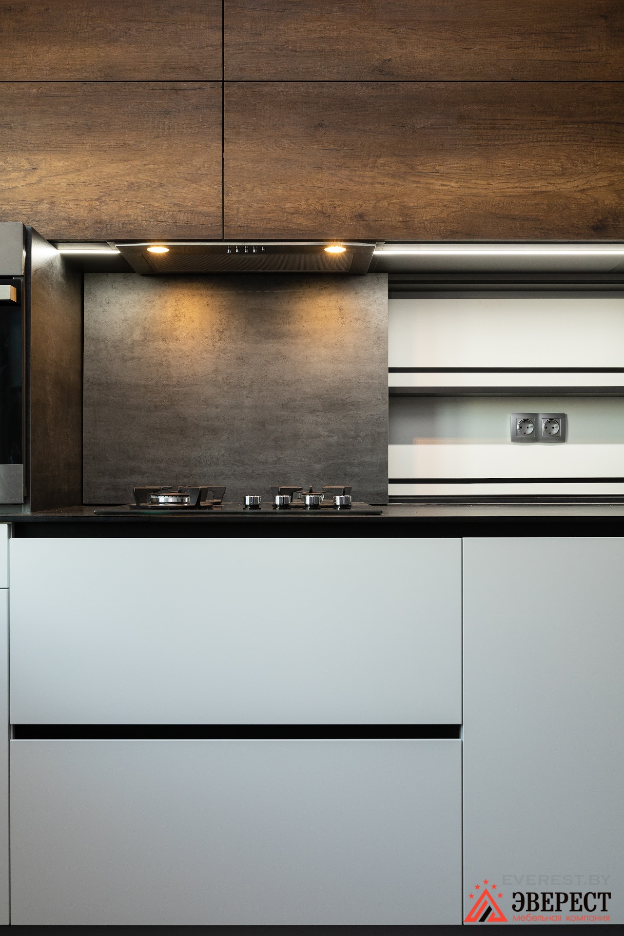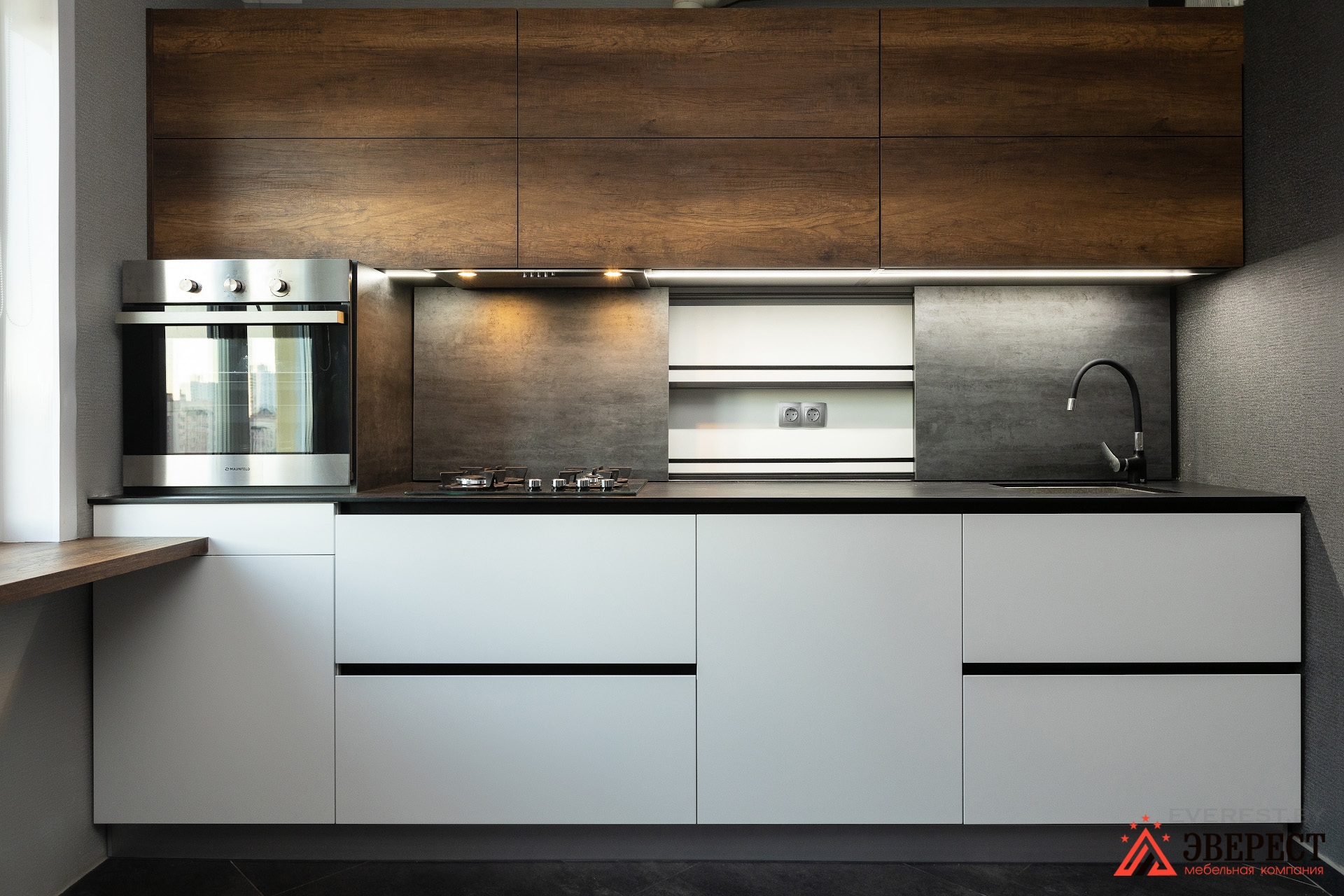 Кухня длиной 220 см. Фасады из ДСП двух цветов.