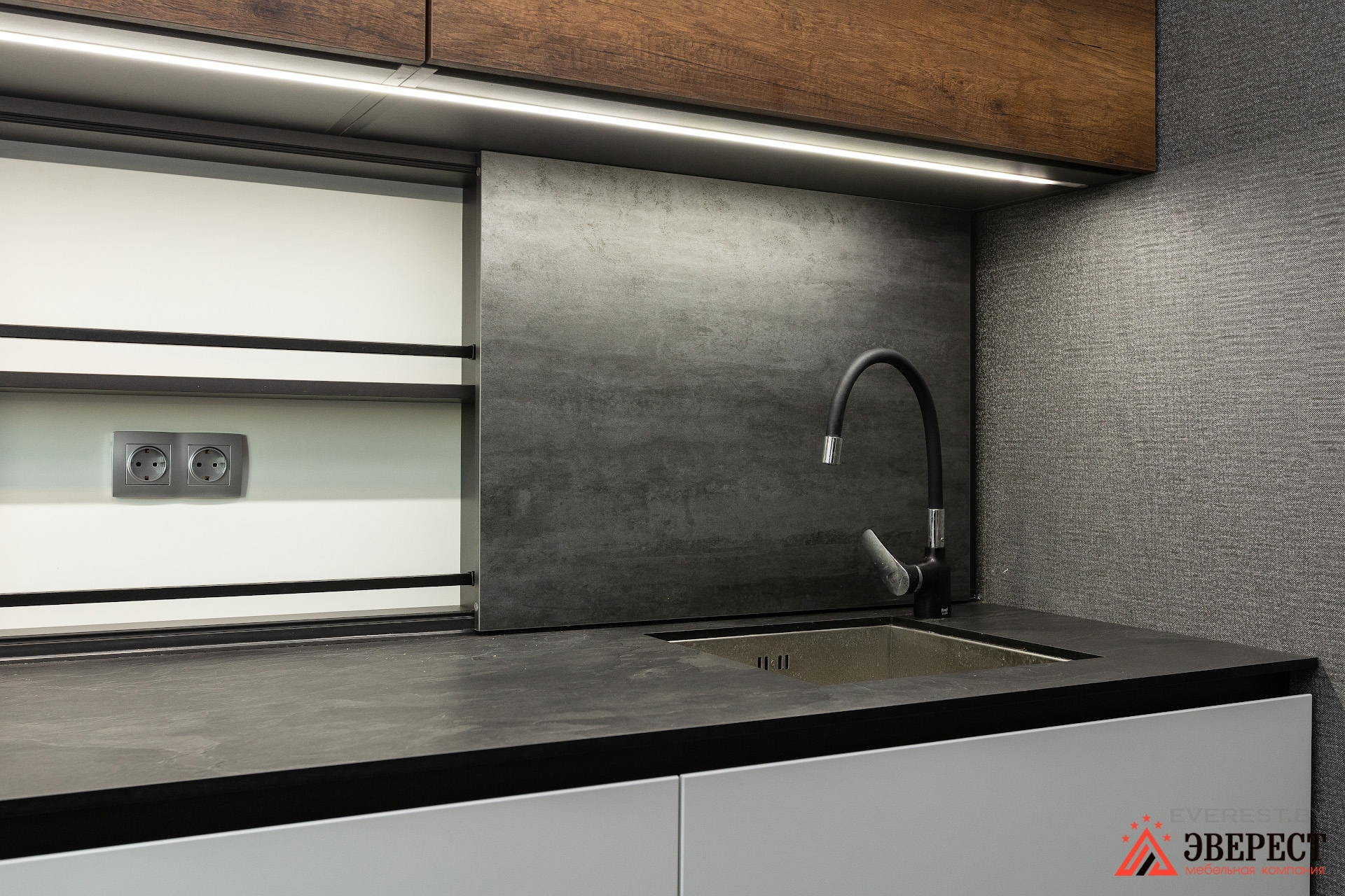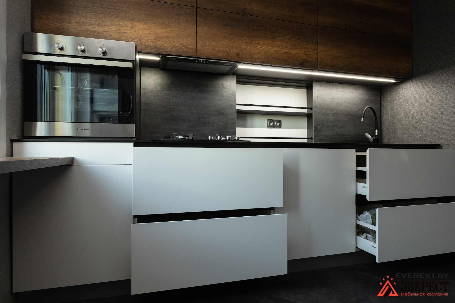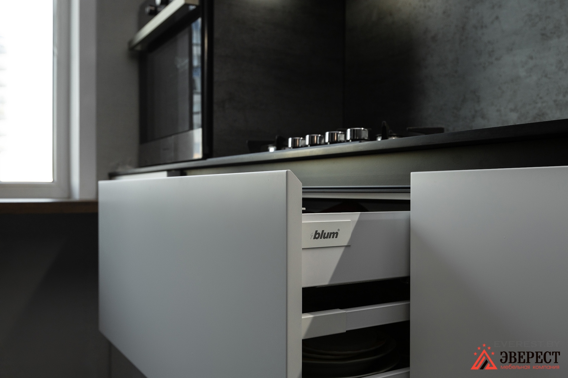 Компактная прямая кухня из МДФ. Фурнитура Blum.