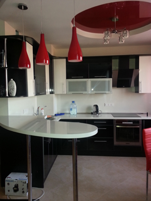 Кухня с радиусной барной стойкой выполнена в черно-белой расцветке, что придает всей конструкции оригинальный и стильный вид. Белая глянцевая столешница изготовлена из прочных высококачественных материалов.