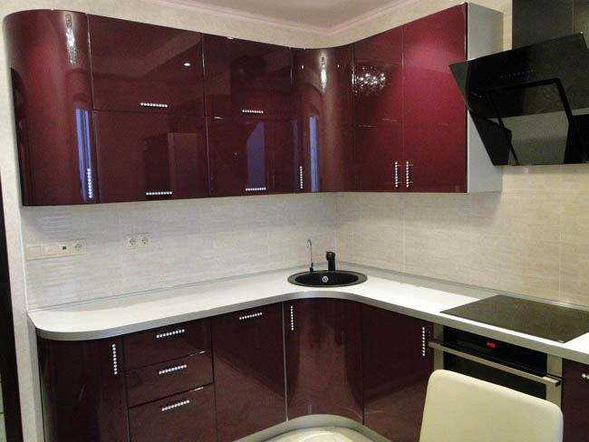Кухня с радиусными бордовыми фасадами
