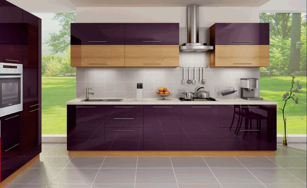 Изысканная кухня исполнена в неординарном дизайне с креативными фасадами фиолетового цвета в ультрасовременном глянце. Столешница просторная и гладкая, со встроенной мойкой и варочной панелью. Отличительной особенностью кухни является отдельный модуль со шкафчиками, в который можно встроить технику.
