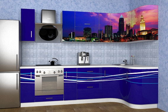 код 90968Синий гарнитур в современном стиле дополнен ярким фотопринтом с небоскребами.