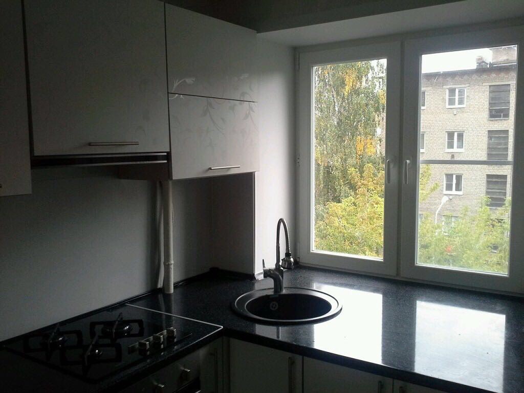 код 88527Темная глянцевая столешница объединена с подоконником.