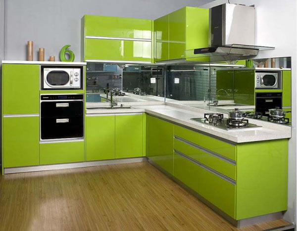 Фасады угловой кухни окрашены в салатовый цвет, который благоприятно скажется на аппетите и настроении. Особенностью гарнитура станет зеркальный фартук, который визуально расширит помещение. Глянцевое покрытие фасадов подчеркивает яркое исполнение.