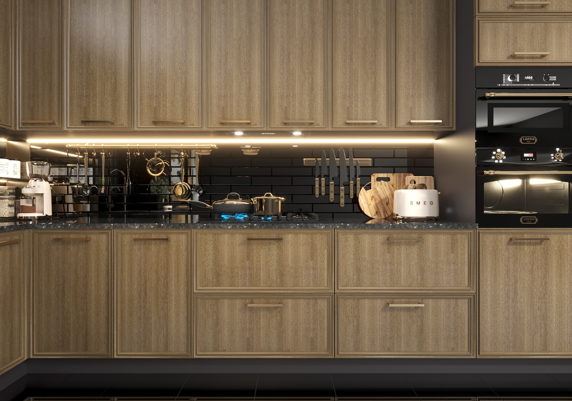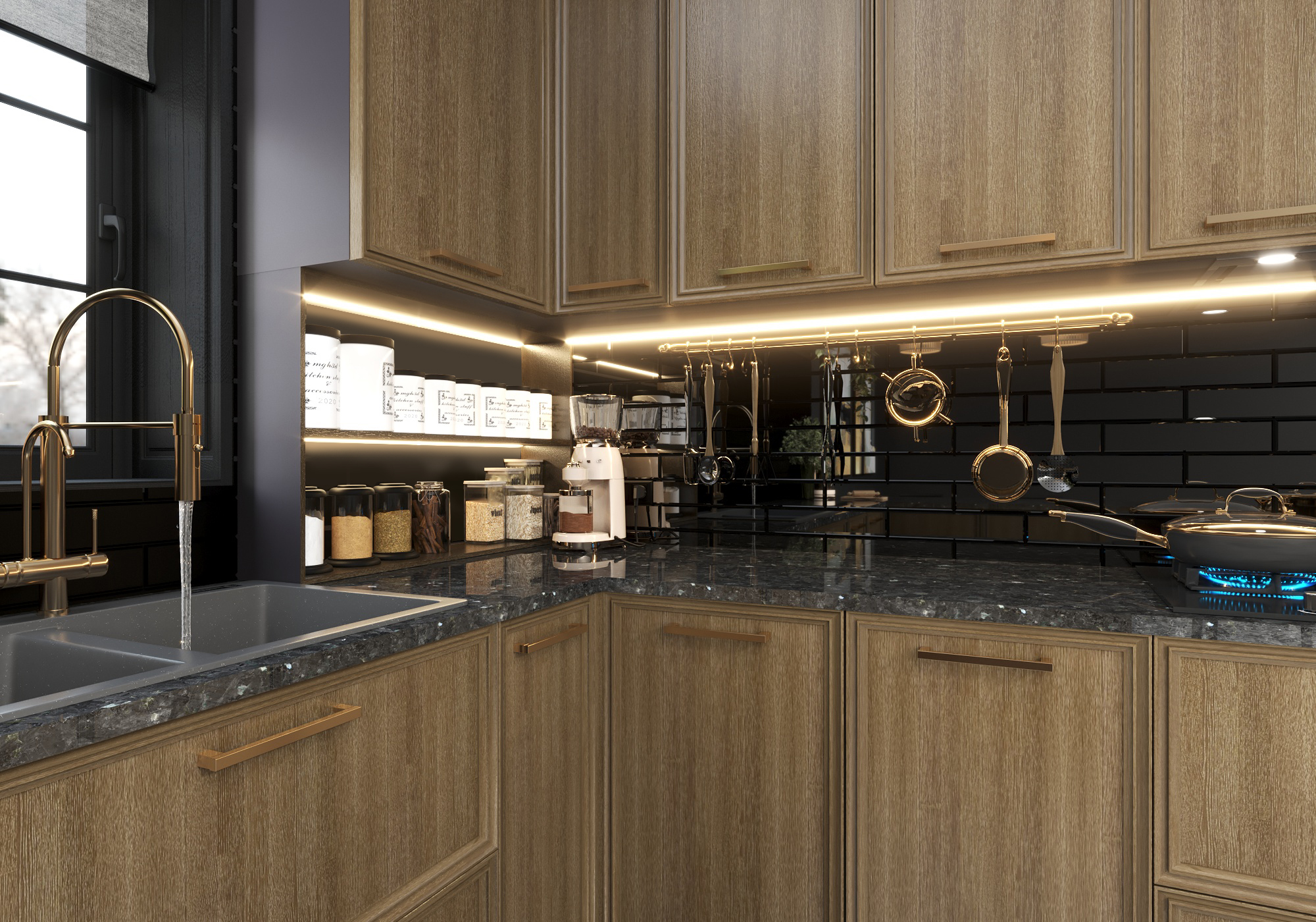 Угловая кухня с профильной ручкой и фасадами из МДФ и ДСП