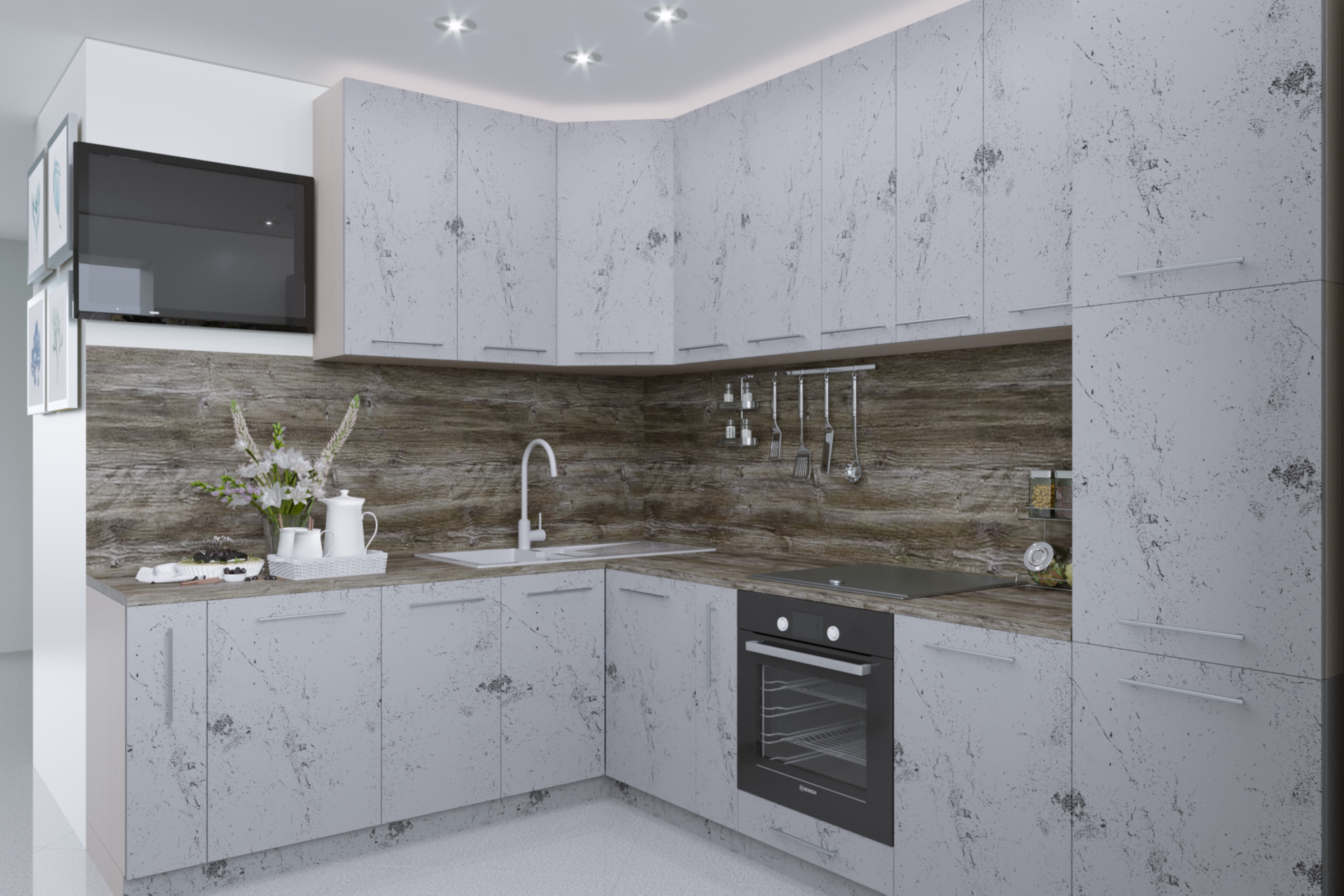 Прямая кухня «Эльза СН-114» МДФ 2.2 м, бетон белый/бетон графит