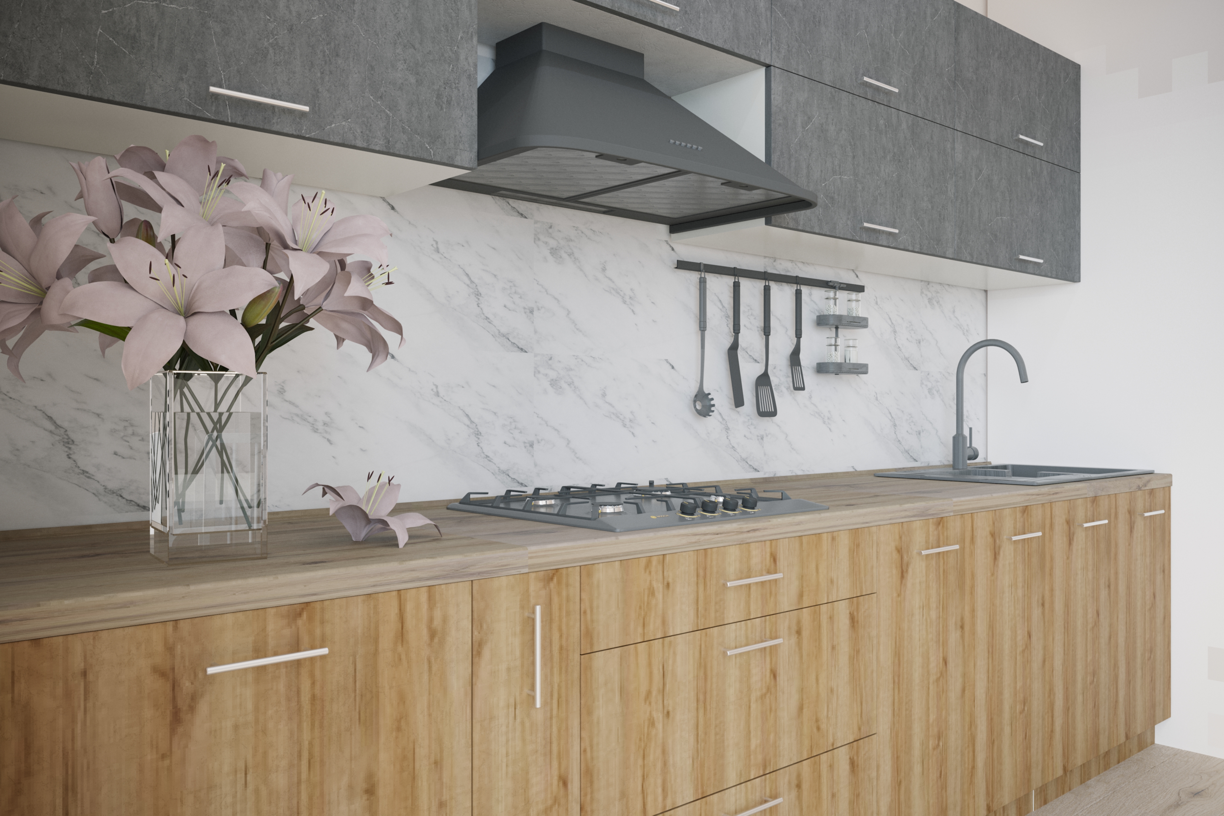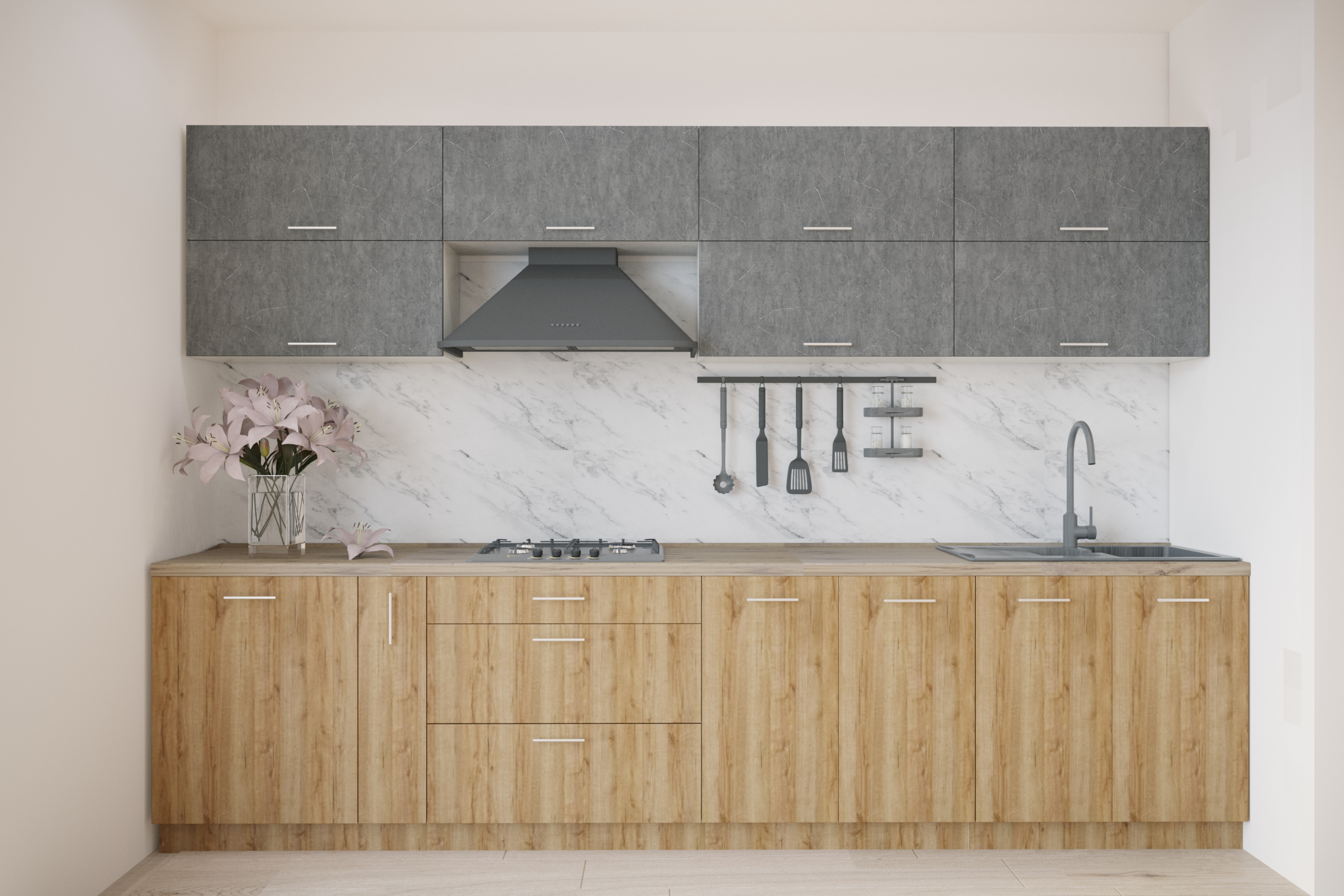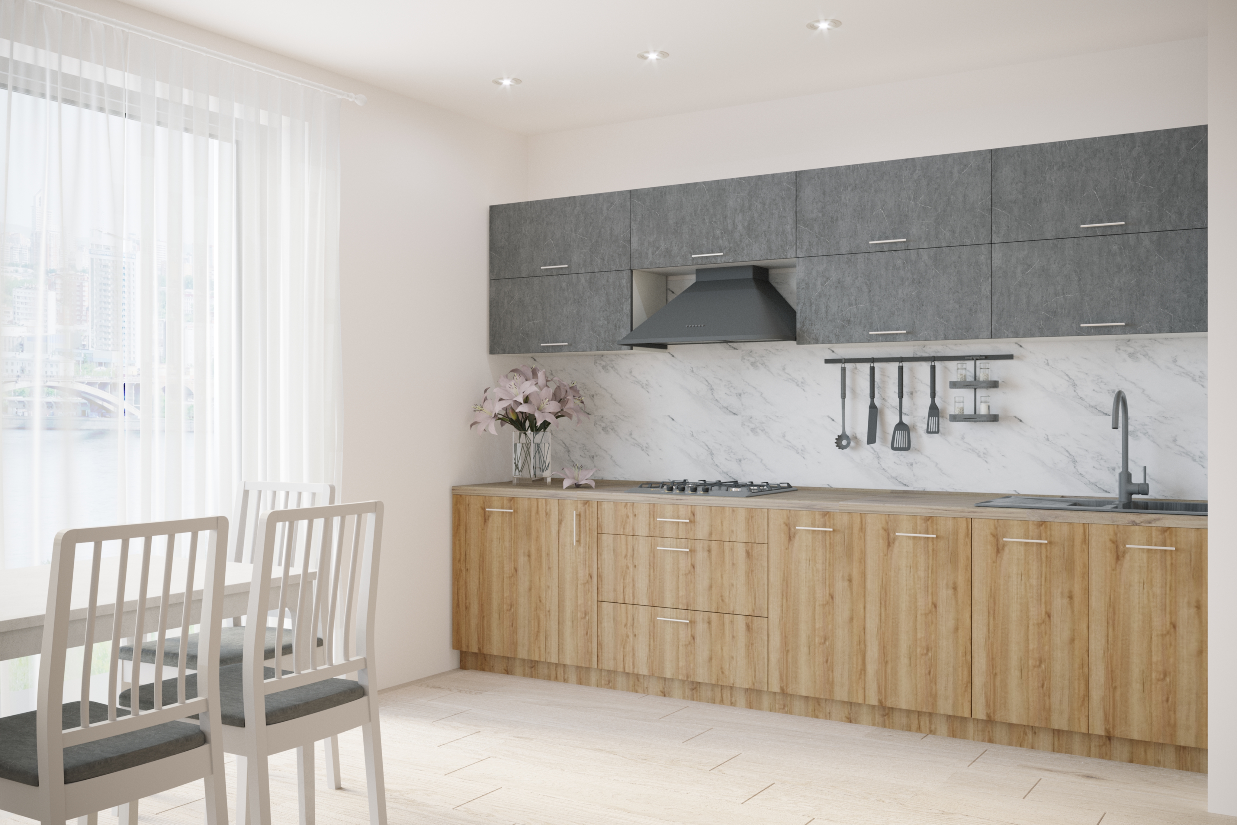 Лаконичные ручки-рейлинги и столешница с древесной текстурой.