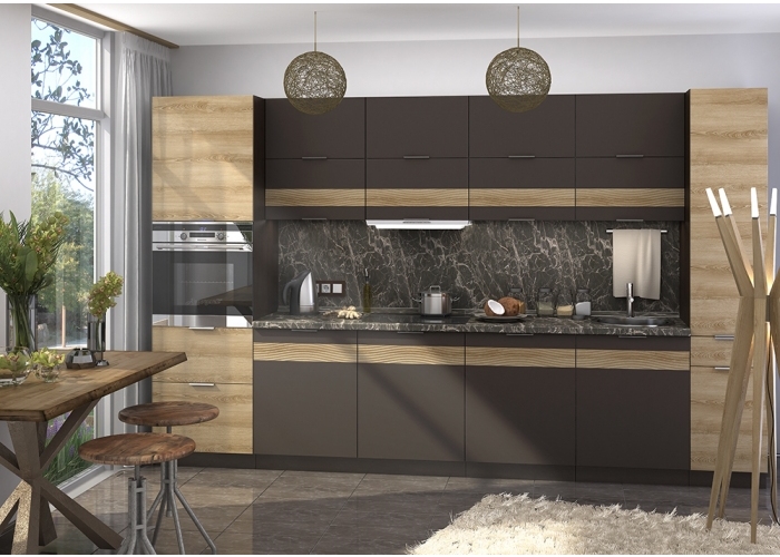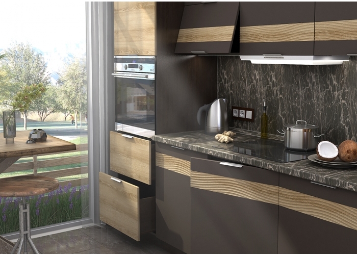 Эта кухня хорошо впишется и в обычную белорусскую квартиру. Ровные линии и повторяющиеся элементы создают завораживающий ритм в отделке. А приятный шоколадный цвет корпуса прекрасно дополняет футуристические матовые детали.