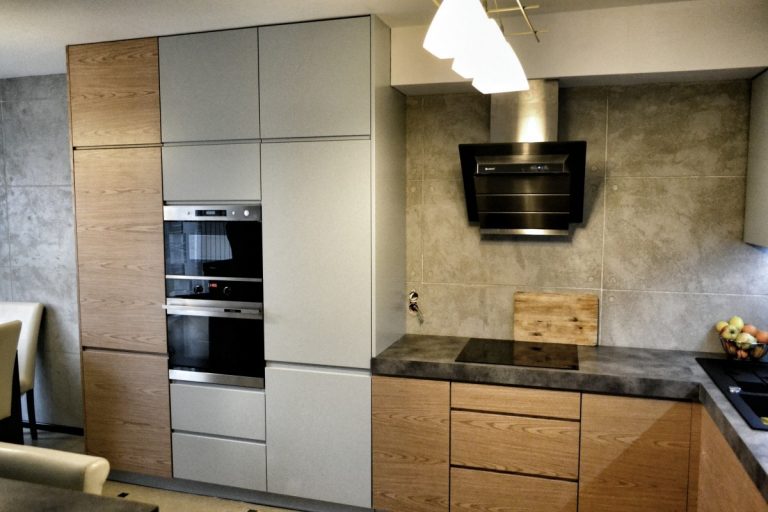 Угловая кухня в скандинавском стиле со шкафом для встроенной техники. Сочетание древесной фактуры и серого матового.