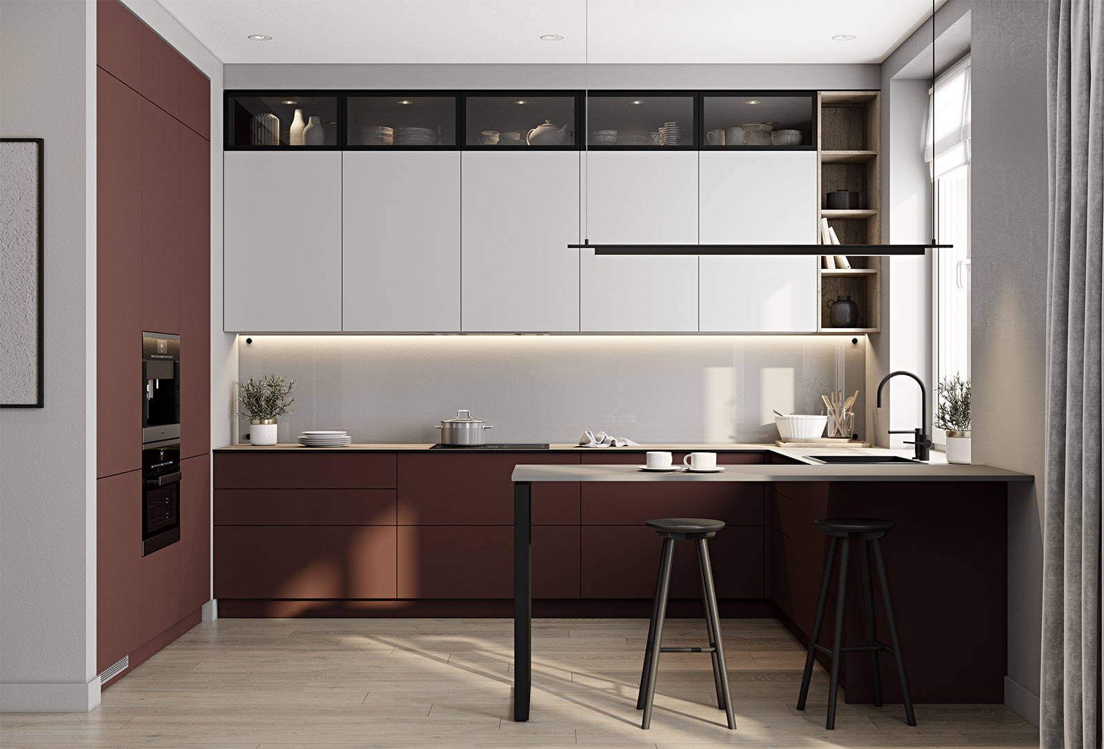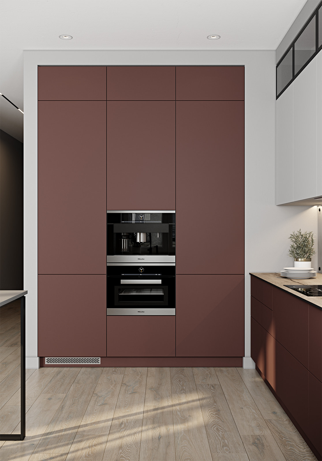 Современный дизайн. Фасады без ручек. Ниши для встраиваемой техники.