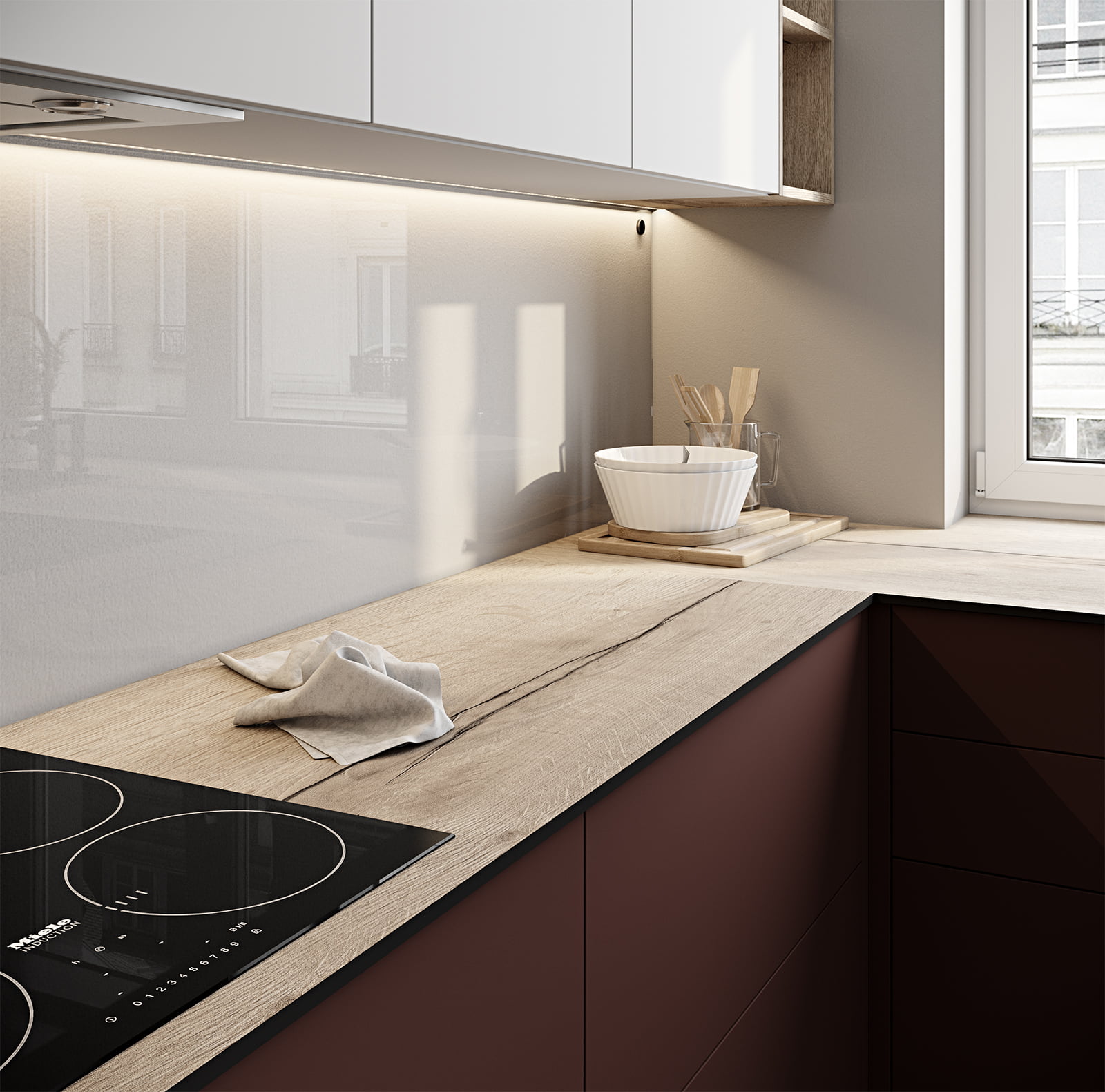 Фасады акрил fenix ntm, цвет россо ntm (0751) / светло-серый ntm (0725) столешница компакт-плита, 13 мм, декор галифакс