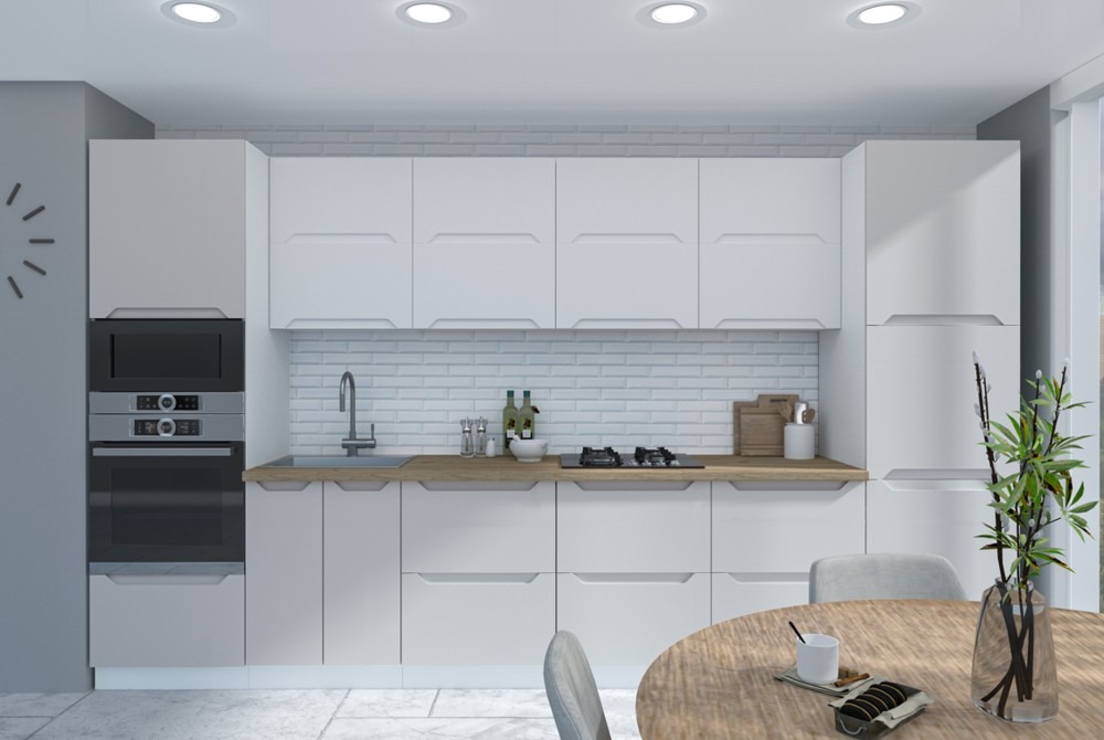 Белые фасады с фрезеровкой. Ширина кухни 210 см.