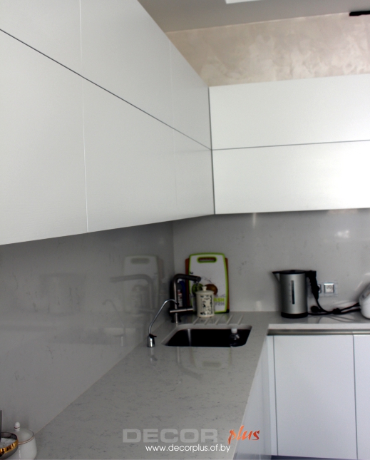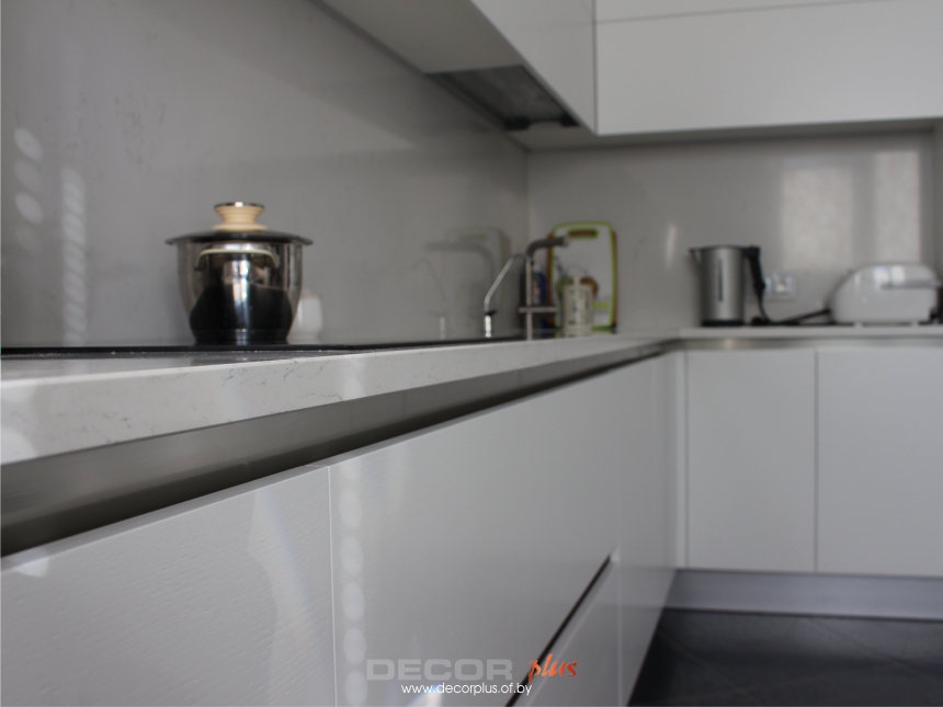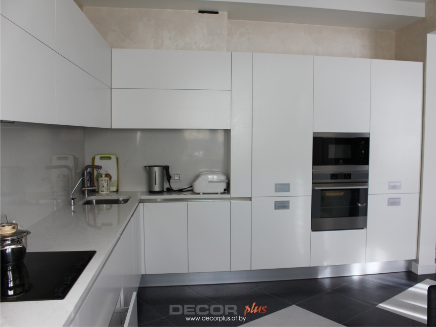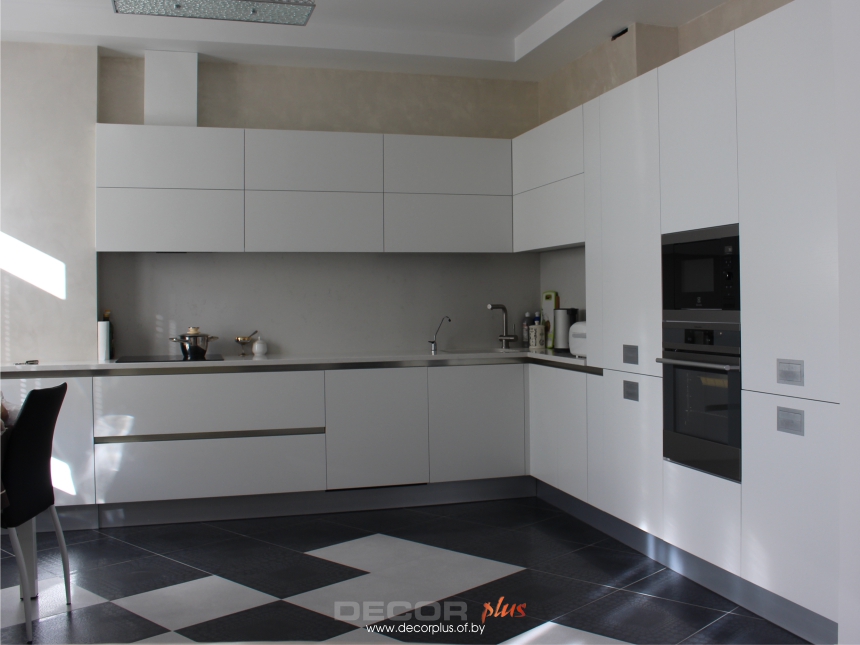 Просторная белая матовая кухня со встроенным холодильником и духовым шкафом. В корпус встроена подсветка рабочей поверхности, а фартук и столешница выполнены из натурального камня. Фасады с ручками профиль и с технологией открытия одним нажатием.