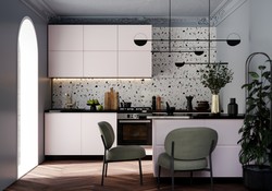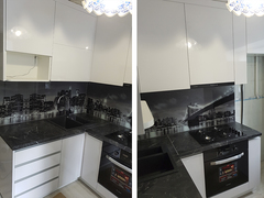 Кухня компактная и функциональная. Она подойдет и для городской квартиры, и для загородого дома. Корпус выполнен из ДСП, который на сегодняшний день, один из экологически чистых материалов и это выгодно отличает данную модель кухни. Элементы фурнитуры такие как реллинговые ручки позволят с пользой использовать пространство между навесными элементами кухни и столешницей.