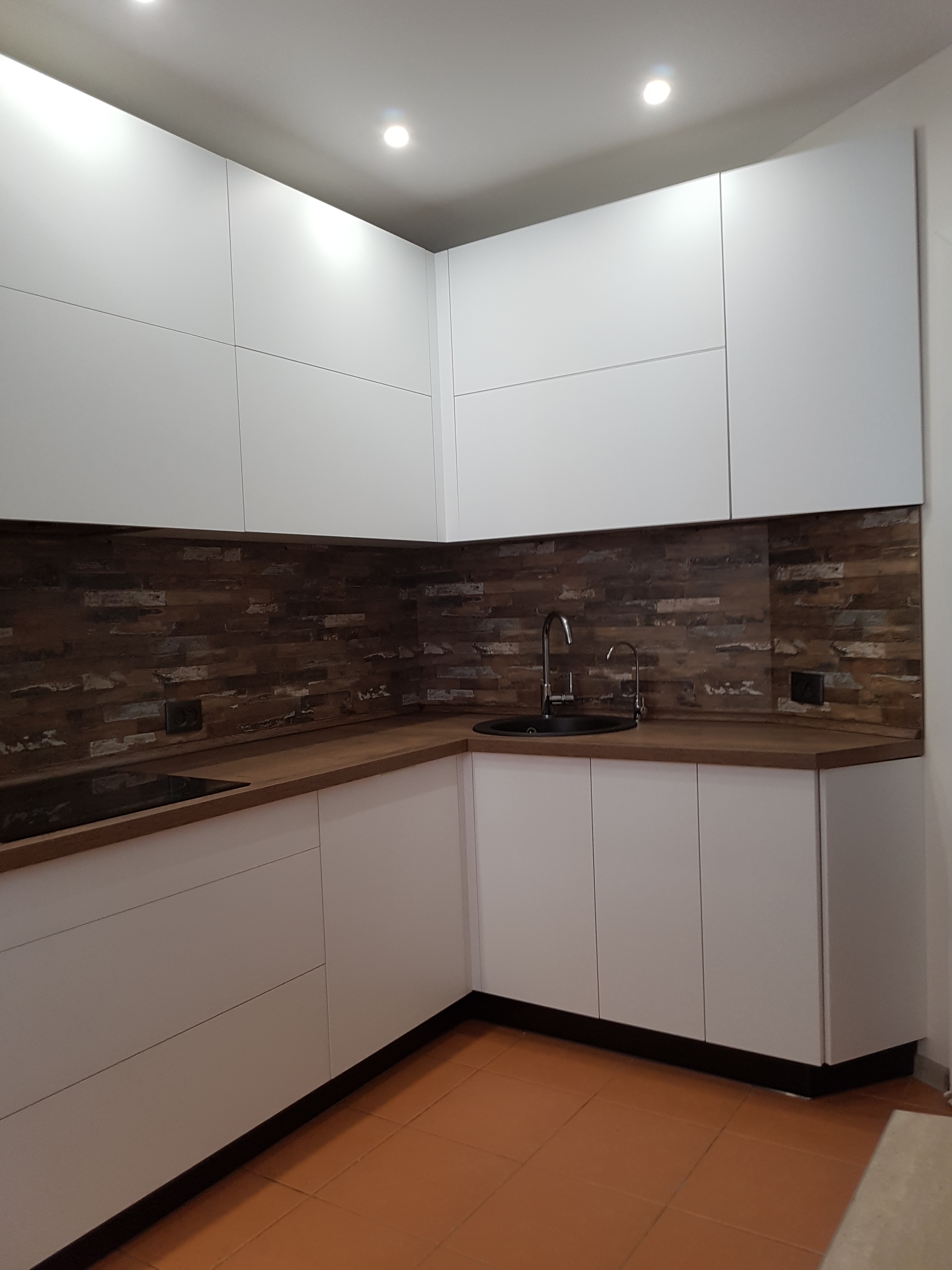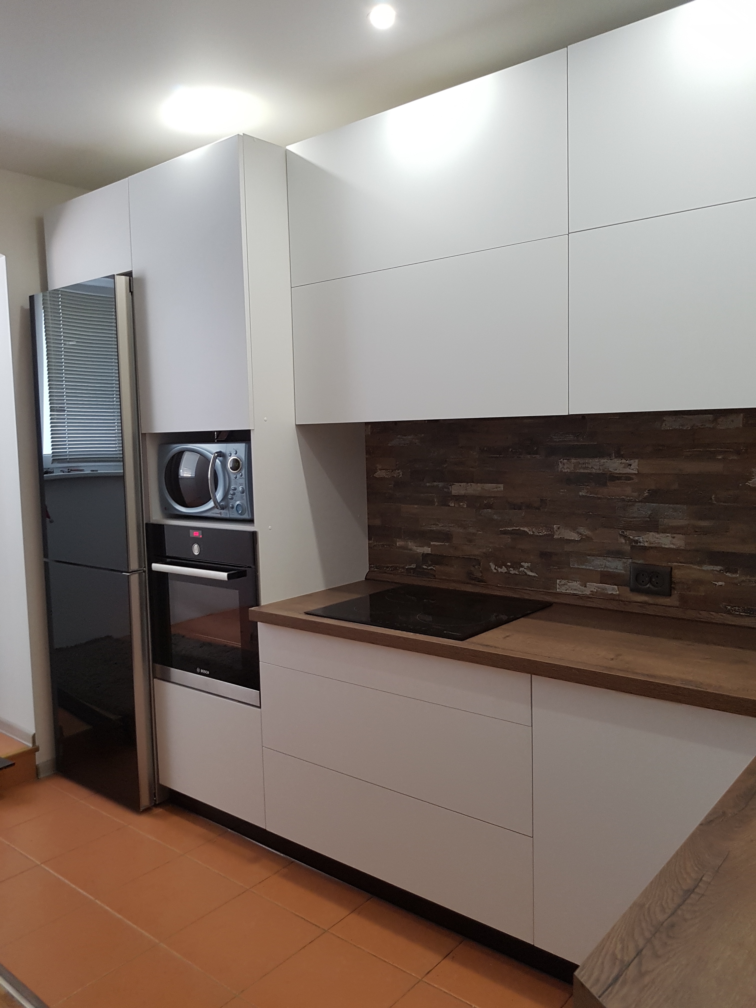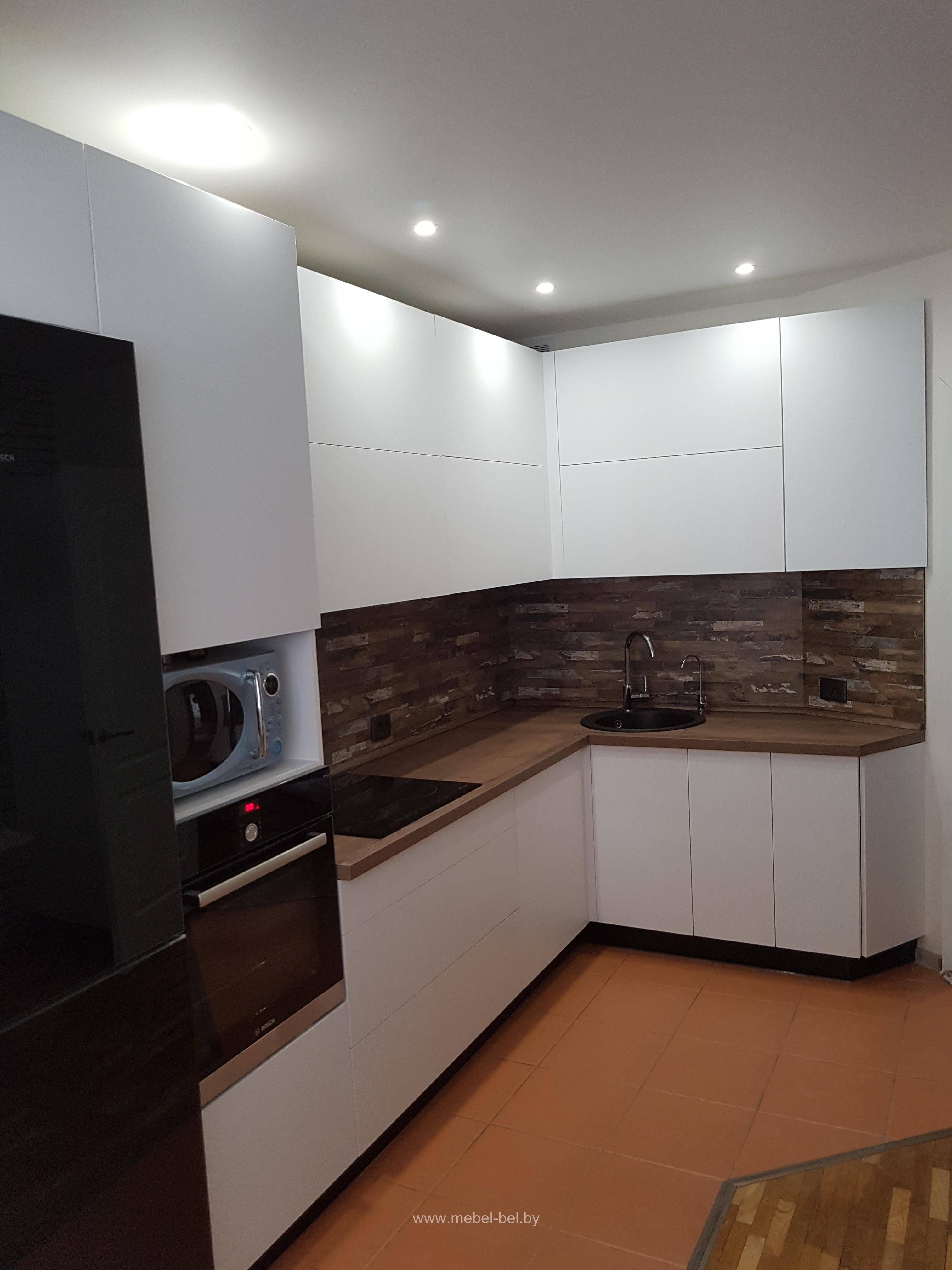 Матовая кухня из акрила без ручек с единым пространством для готовки пищи и хранения посуды. Рабочая область изготовлена из ДСП Egger, что гарантирует высокое качество всего гарнитура, а особенно той ее части, которая более всего подвержена повреждениям или загрязнениям. К минималистичному облику кухни добавляется нотка лофта в виде скинали с изображением под мелкий кирпич.