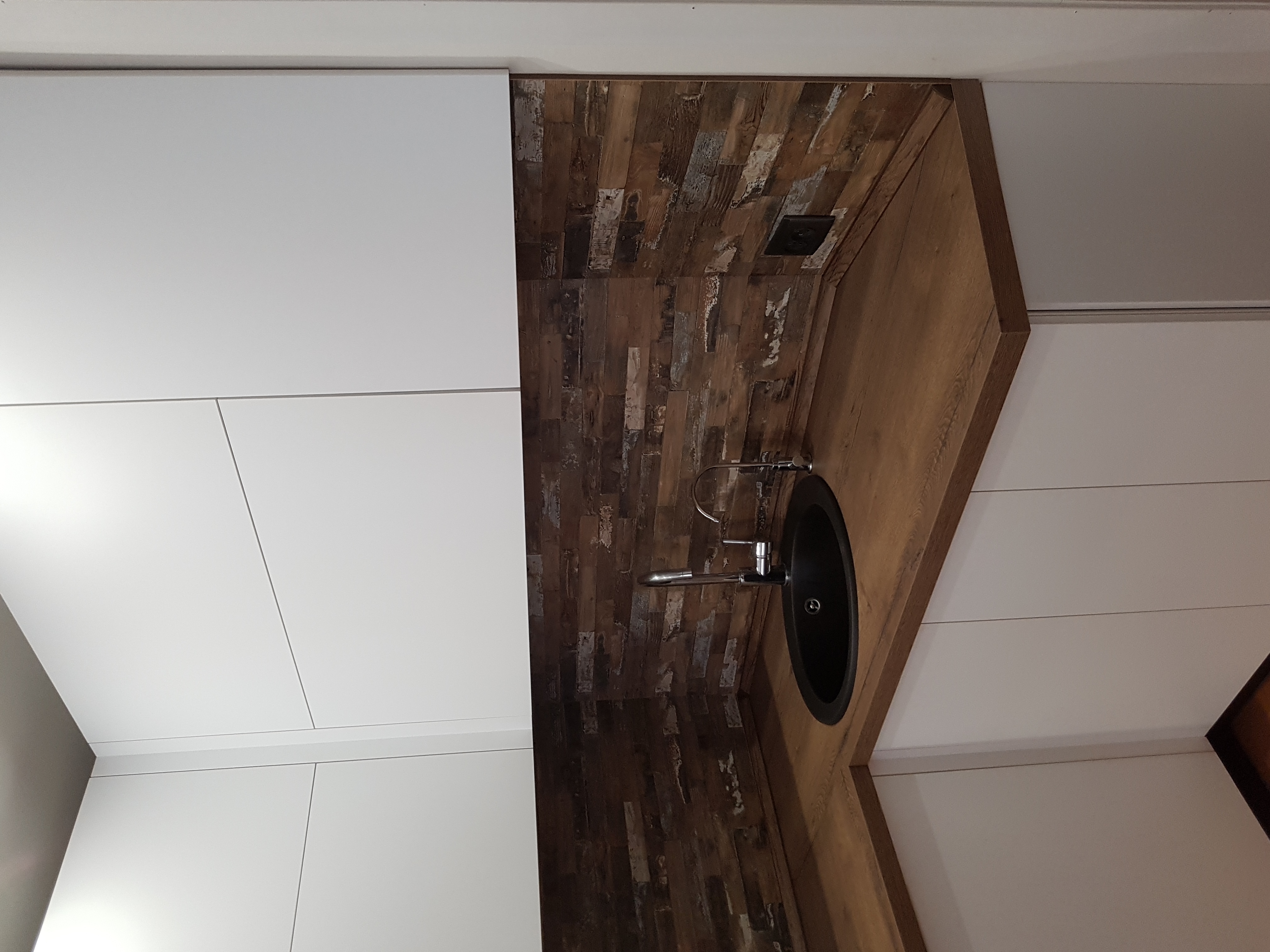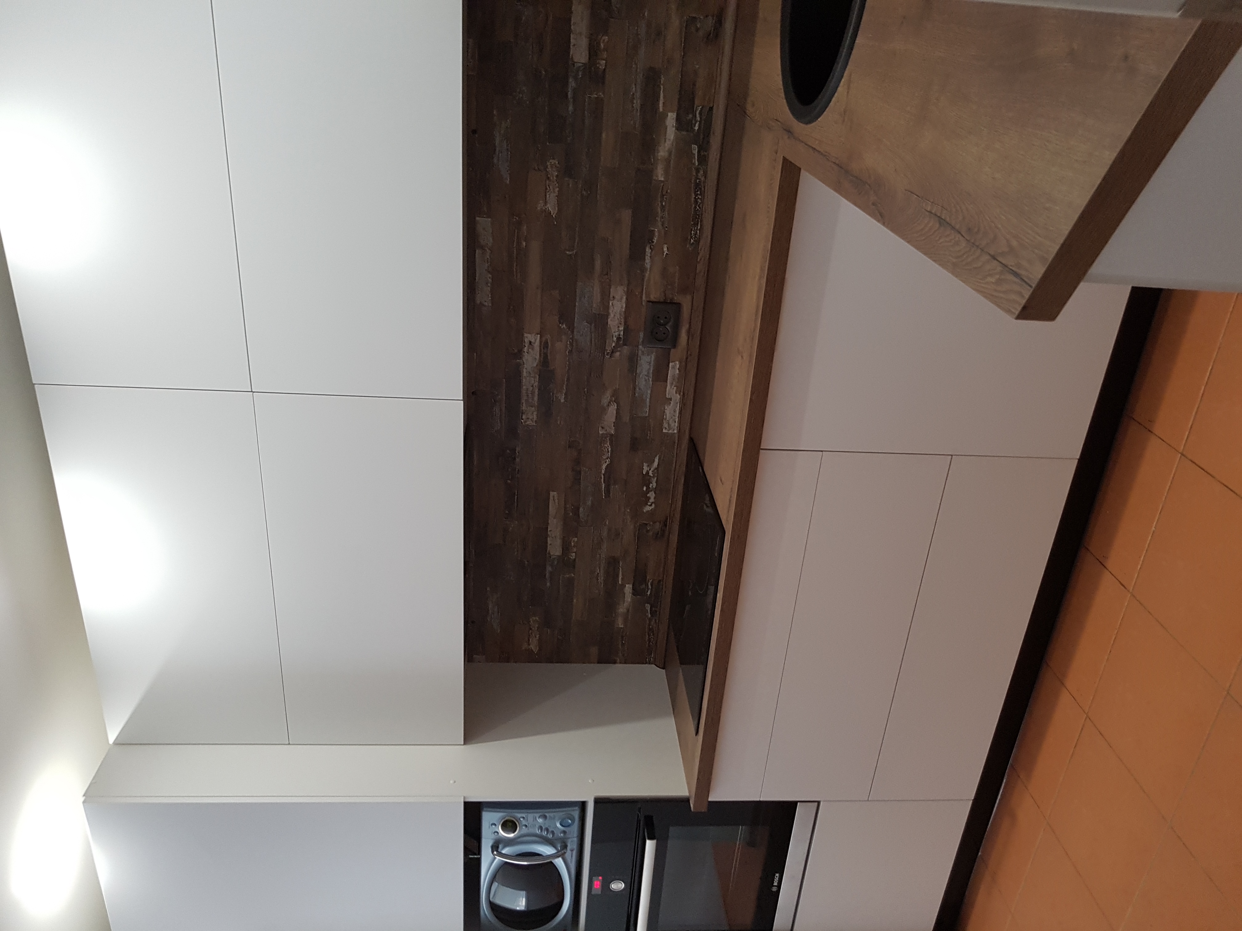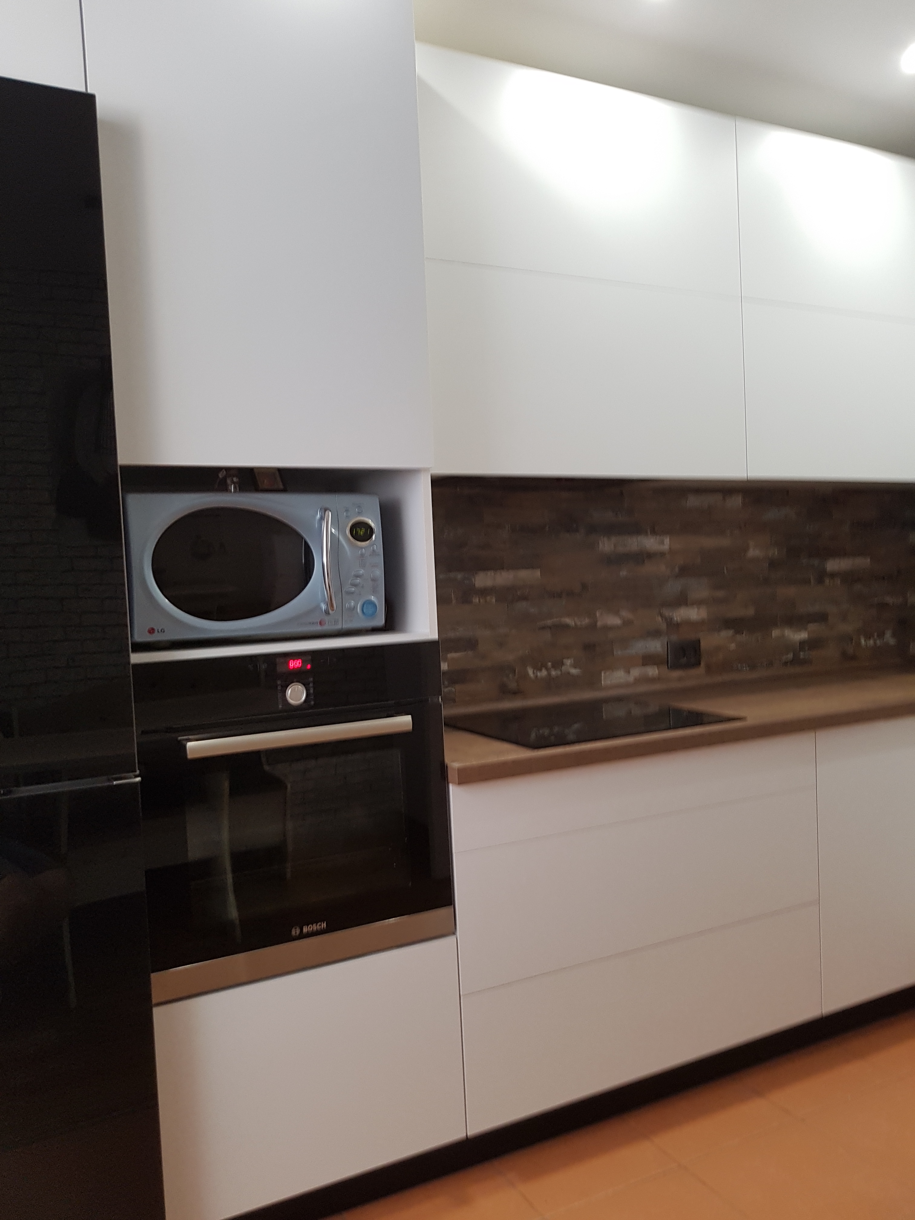 Матовая кухня из акрила без ручек с единым пространством для готовки пищи и хранения посуды. Рабочая область изготовлена из ДСП Egger, что гарантирует высокое качество всего гарнитура, а особенно той ее части, которая более всего подвержена повреждениям или загрязнениям. К минималистичному облику кухни добавляется нотка лофта в виде скинали с изображением под мелкий кирпич.