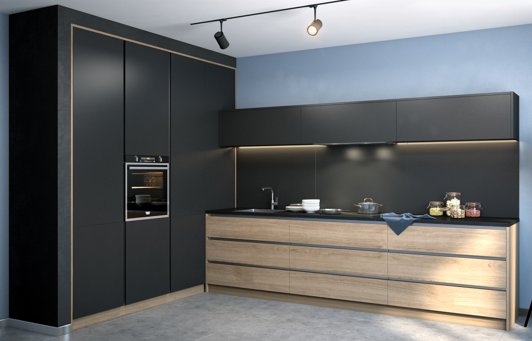 Стильный минималистичный и по-скандинавски функциональный кухонный гарнитур. Правое крыло кухни обладает рабочей поверхностью с подсветкой и темной столешницей под камень. Нижний фасад облицован под светлую древесину. Встроенное левое крыло, как навесной модуль и фартук, изготовлено в матовом черном графитовом цвете. Во встроенный блок вмонтированы ниши для холодильника и духовой печи. Фасады без ручек.