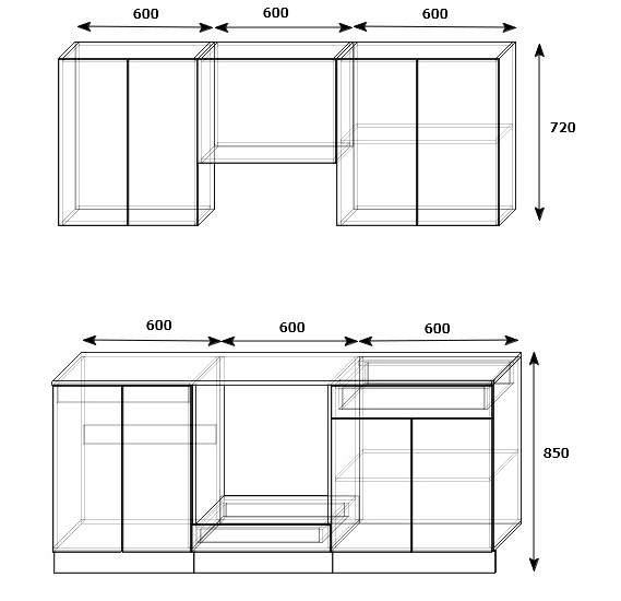 Низ комплекта состоит из мойки, стола с 2 створками, стола с 3 ящиками.