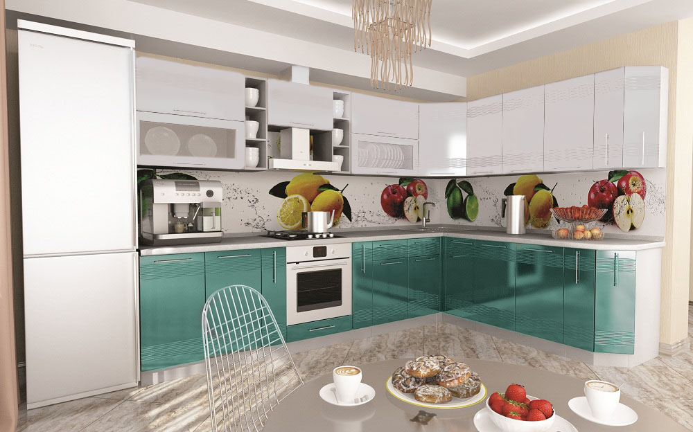 код 88078Угловая кухня в свежих тонах и элементами 3D на фасаде.